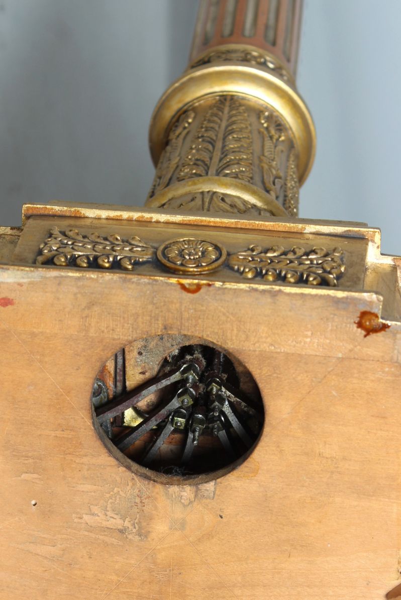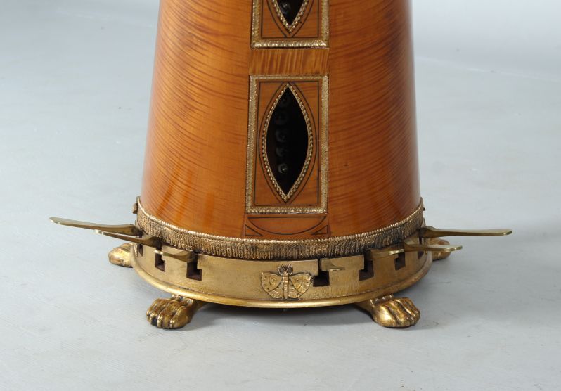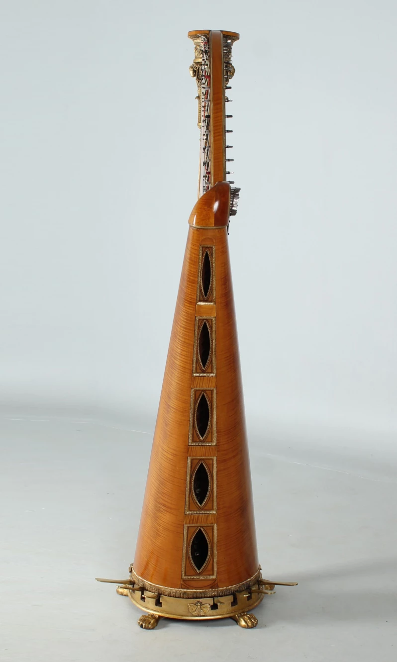 Der auf Tatzenfüßen stehende Sockel des Instrumentes ist kunstvoll stuckiert mit Palmetten, Hippokampen und Lyren. Rückseitig befinden sich sieben ausklappbare Pedale zum Einstellen der Halbtöne und ein großer Schmetterling.