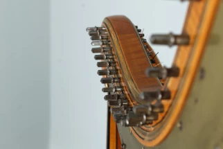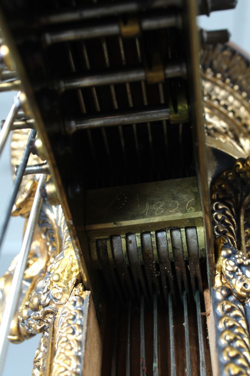 Der Kopf des Instrumentes lässt sich rückseitig öffnen und gibt den Blick frei auf eine unscheinbare Gravur, möglicherweise das Herstellungsjahr dieser Harfe, 1826. Auf den Fotos ist das gut zu erkennen.