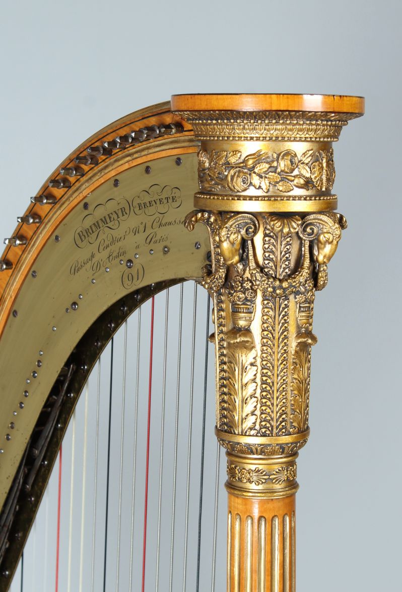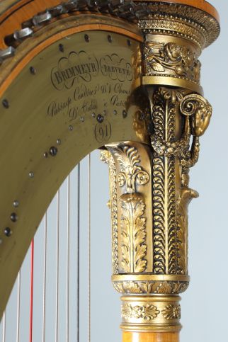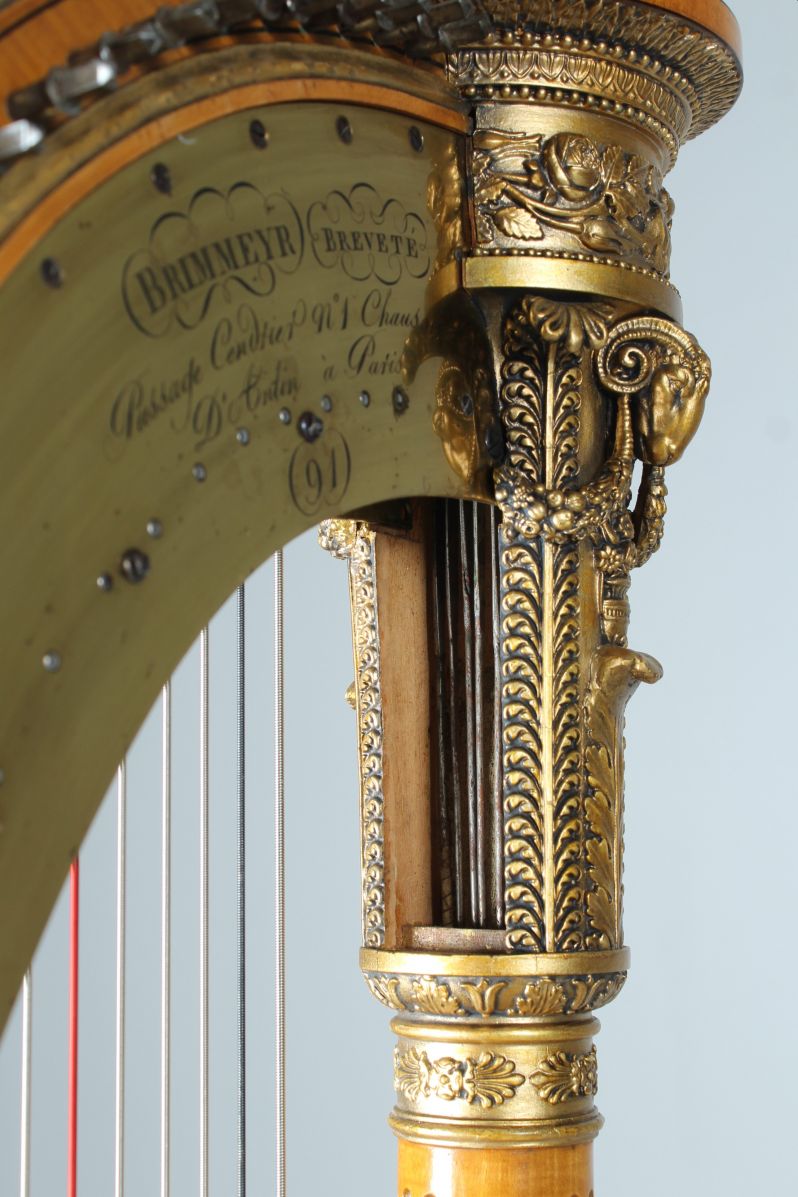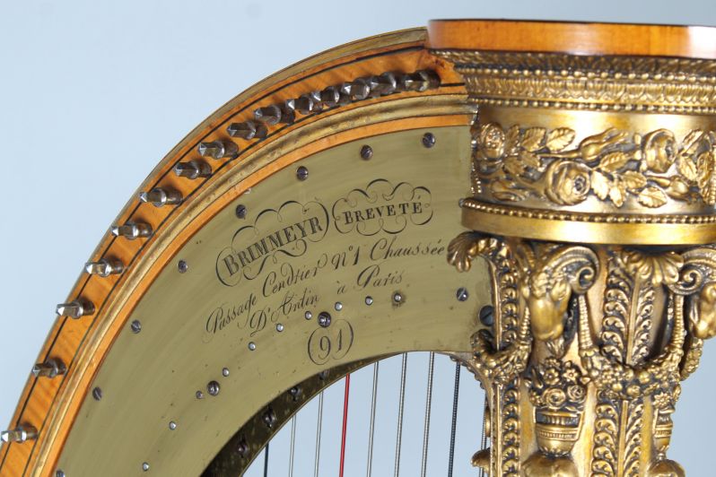Die hier angebotene Harfe kann sicher auf die Zeit zwischen 1816 und 1830 datiert werden. François-Xavier Brimmeyer, auch bekannt als Brimmeyr oder Brumaire, meldete im Jahre 1816 ein Patent bzgl. der Pedalerie an. Seit dem Jahre befindet sich neben der Signatur auch der Schriftzug BREVETE. Ab 1830 entwickelte Brimmeyr gemeinsam mit Jean Pfeiffer ein weiteres Patent. Ab dem Zeitpunkt wurde mit PFEIFFER BRIMMEYR signiert. Exemplare mit dieser Signatur sind unter anderem im Besitz des Musée de la Musique in Paris und des Metropolitan Museum Of Art in New York.