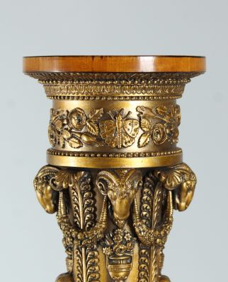 Die feinen Schnitz- und Stuckarbeiten finden sich auch am oberen Ende der kanellierten Säule wider. Wir sehen Palmblätter, Vasen, Fruchtgirlanden und wunderschön ausgearbeitete Widderköpfe. Den oberen Abschluss bildet ein Fries aus Rosenblättern mit einem Schmetterling, als Symbol für Freude und Unbeschwertheit.