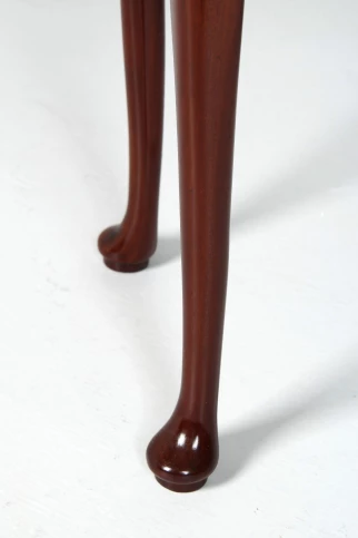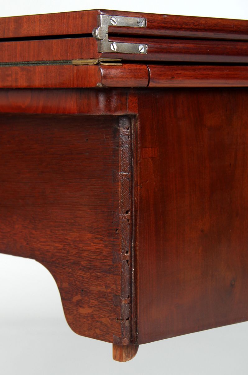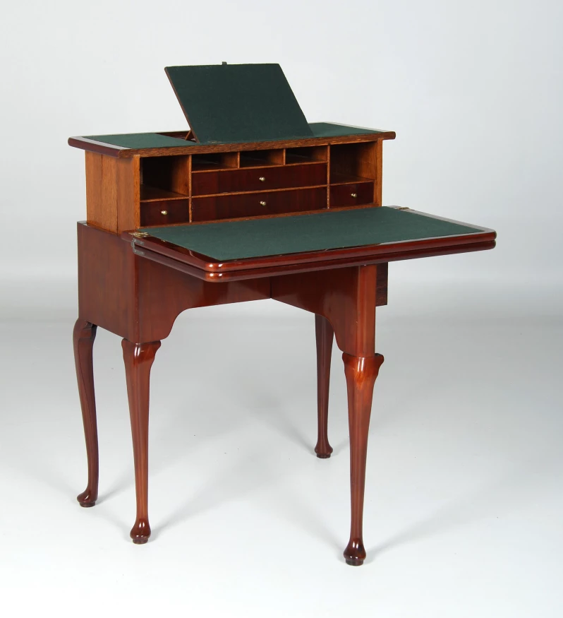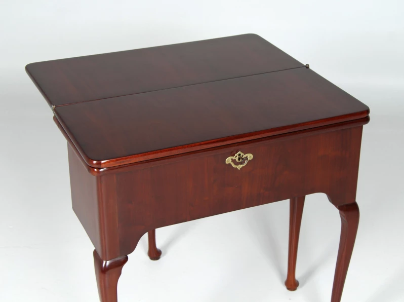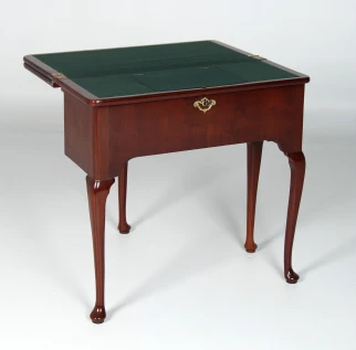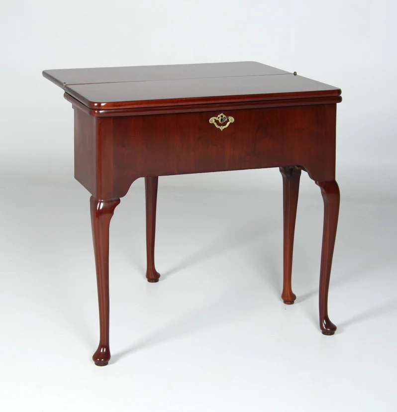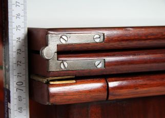 Im geschlossenen Zustand präsentiert sich das Möbel auf vier in typischer George-II-Manier ausgeformten, stehenden Beinen. Die schlichte, hohe Zarge wird mittig von einem fein gesägten Schlüssellochbeschlag aus Messing geziert. Auffallend sind die drei übereinanderliegenden Platten, die bereits die besondere Funktion des Möbels erahnen lassen.