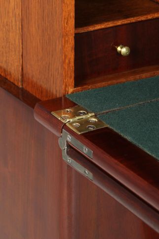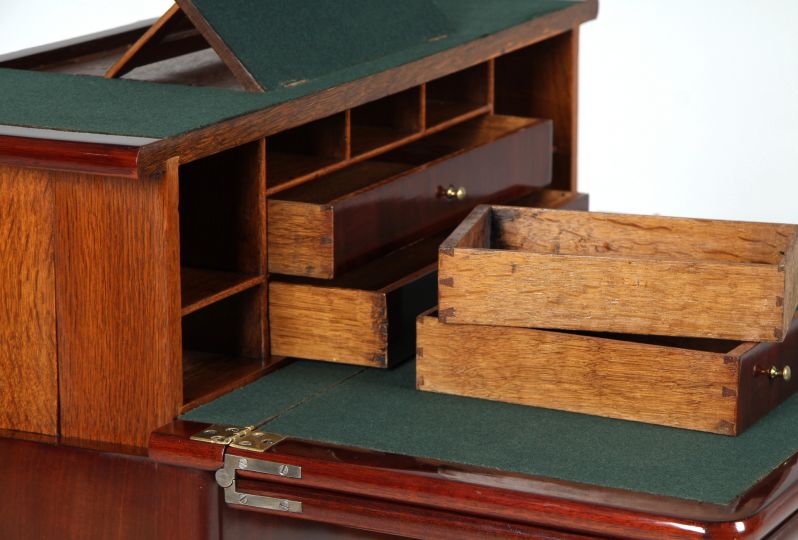 Außergewöhnliches und interessantes Verwandlungsmöbel aus massivem Mahagoni sowie Mahagoni auf Eiche furniert.