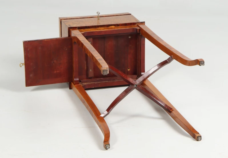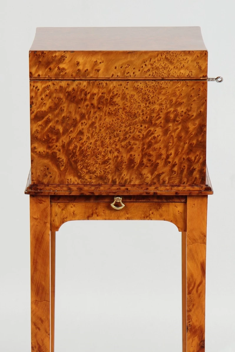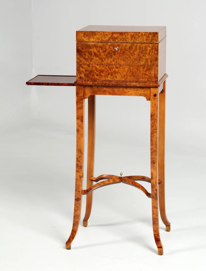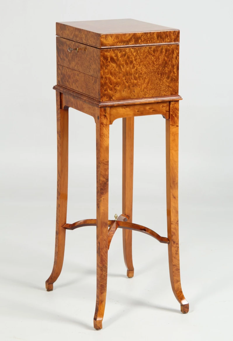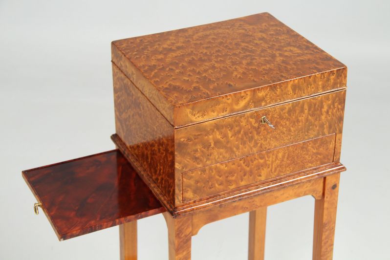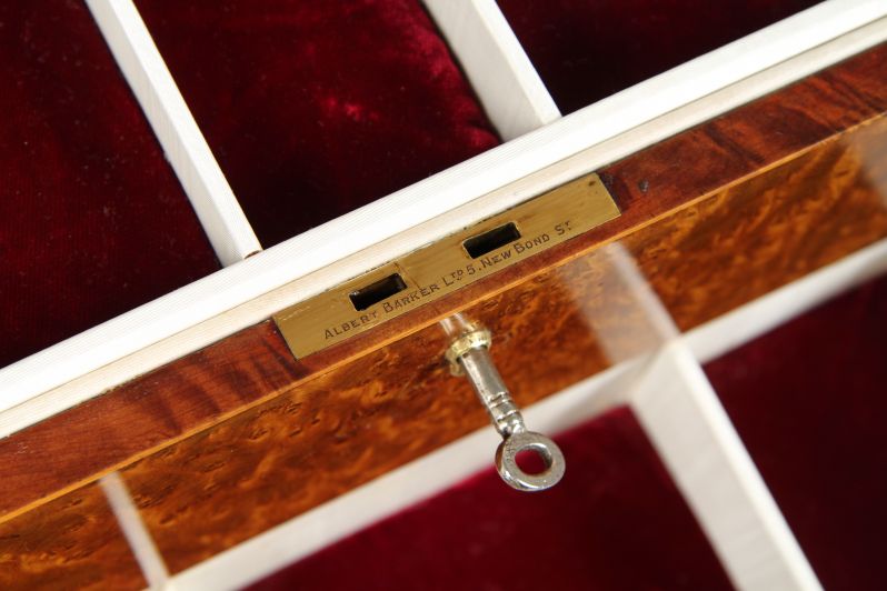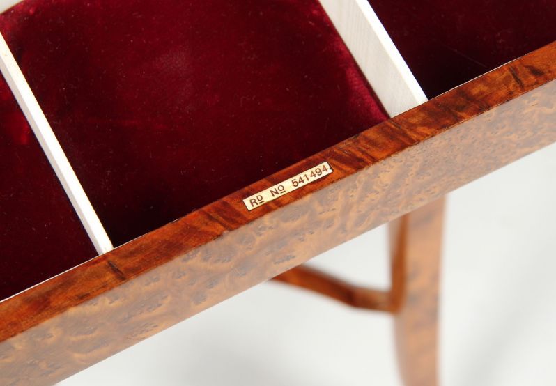 Das Schloss ist graviert: Albert Barker Ltd 5. New Bond St. Barker, der ab den 1890er Jahren als Silberschmied in den Londoner Büchern geführt wird, spezialisierte sich im frühen 20. Jahrhundert auf die Produktion und den Vertrieb von hochwertigen Luxusartikeln. Man vertrieb Bestecke und Schreibutensilien aber auch Kleinmöbel und Utensilien für private Yachten. Gerade Möbel, die für den Gebrauch an Board konzipiert wurden, brauchten gut durchdachte Patente und Sicherungssysteme für Türen und Schubladen. Mit diesem Hintergrund wurde sicher auch der Schließ- und Öffnungsmechanismus des hier angebotenen Tischchens entwickelt. Das Möbelstück war aber sicher nicht zur Verwendung auf See gedacht, sondern passte gut in eine schicke Londoner Wohnung.