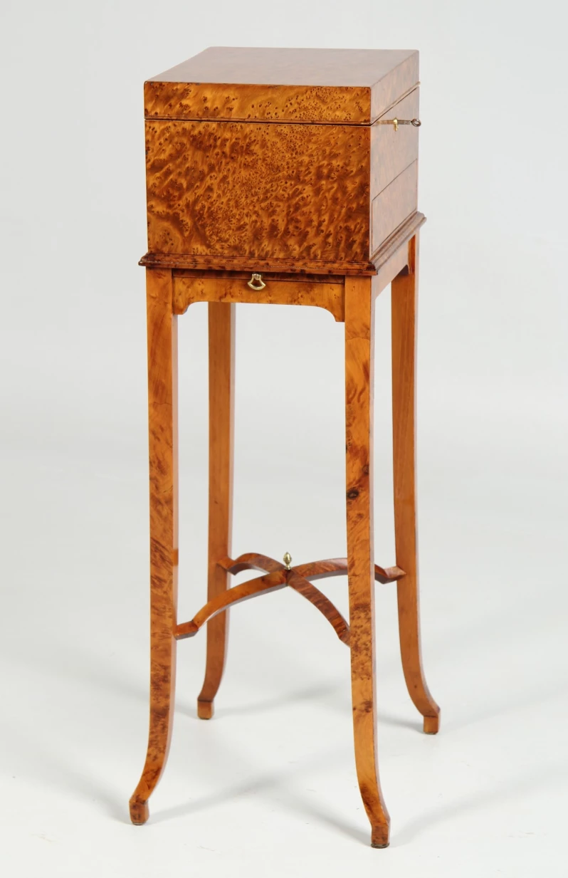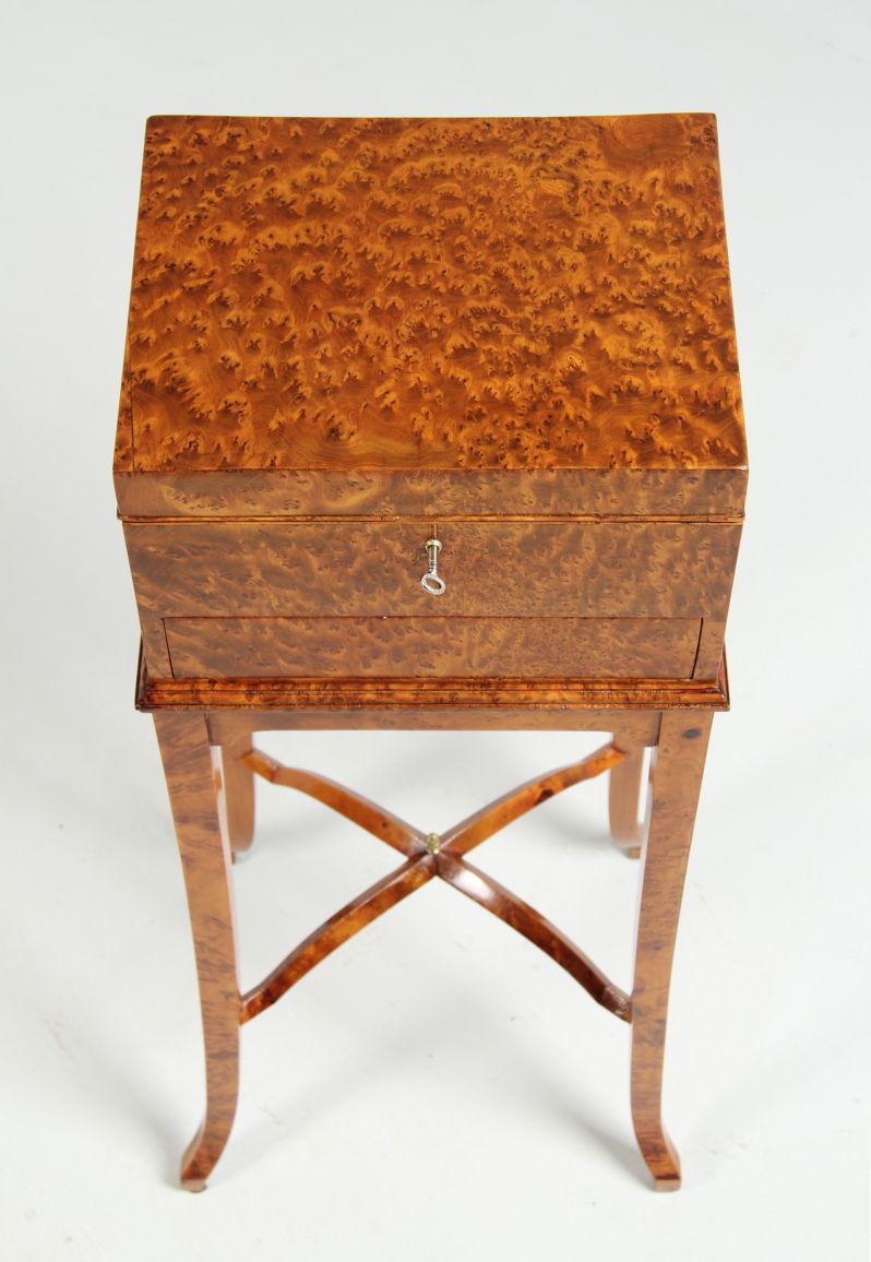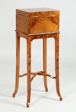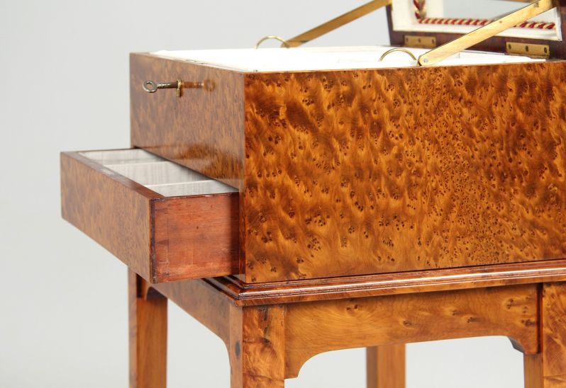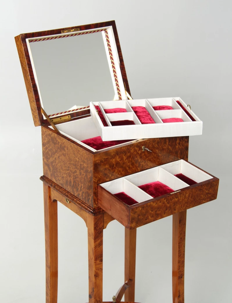 Der Deckel ist von innen verspiegelt und wird von Messingscharnieren gehalten. Sowohl die Lade als auch das Kästchen selbst sind mit Facheinteilungen zur Aufbewahrung von Schmuck versehen. Die Facheinteilungen sind mit Stoff bespannt und unten mit rotem Samt ausgekleidet. Die Bespannung ist neuwertig, sie stammt sicher nicht aus der Entstehungszeit des Möbels.