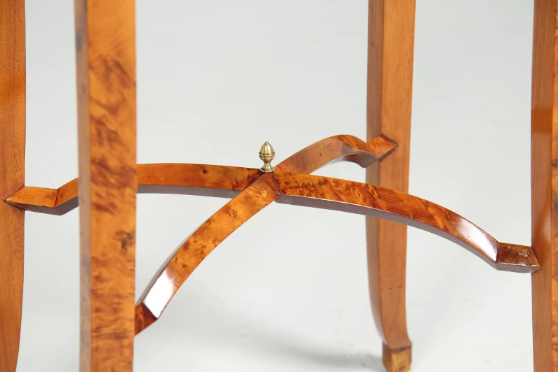 Restaurierter und gut funktionierender Zustand. Die Schellackpolitur gibt dem wild gemaserten Holz eine unglaubliche "Tiefe".