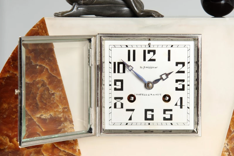 Das quadratische, silbergerahmte Zifferblatt zeigt die für das Art Déco typischen arabischen Ziffern in blockhafter Typografie. Die ebenfalls zeittypischen Zeiger ergänzen die von geometrischen Konturen geprägte Ästhetik der Uhr. Das Zifferblatt trägt die Signatur H. Boisson, Chatellerault, wohl die Signatur eines damaligen Juweliergeschäftes oder Uhrenhändlers aus der französischen Provinz Poitou.