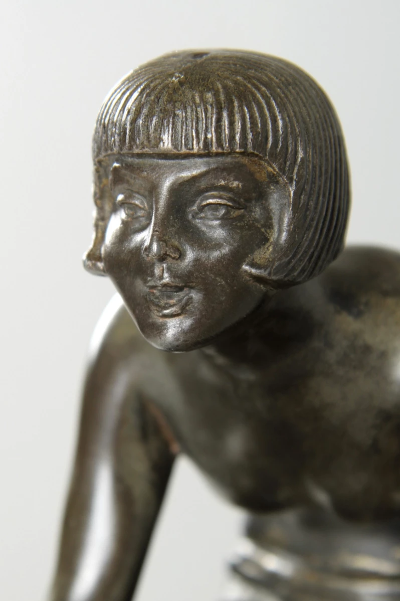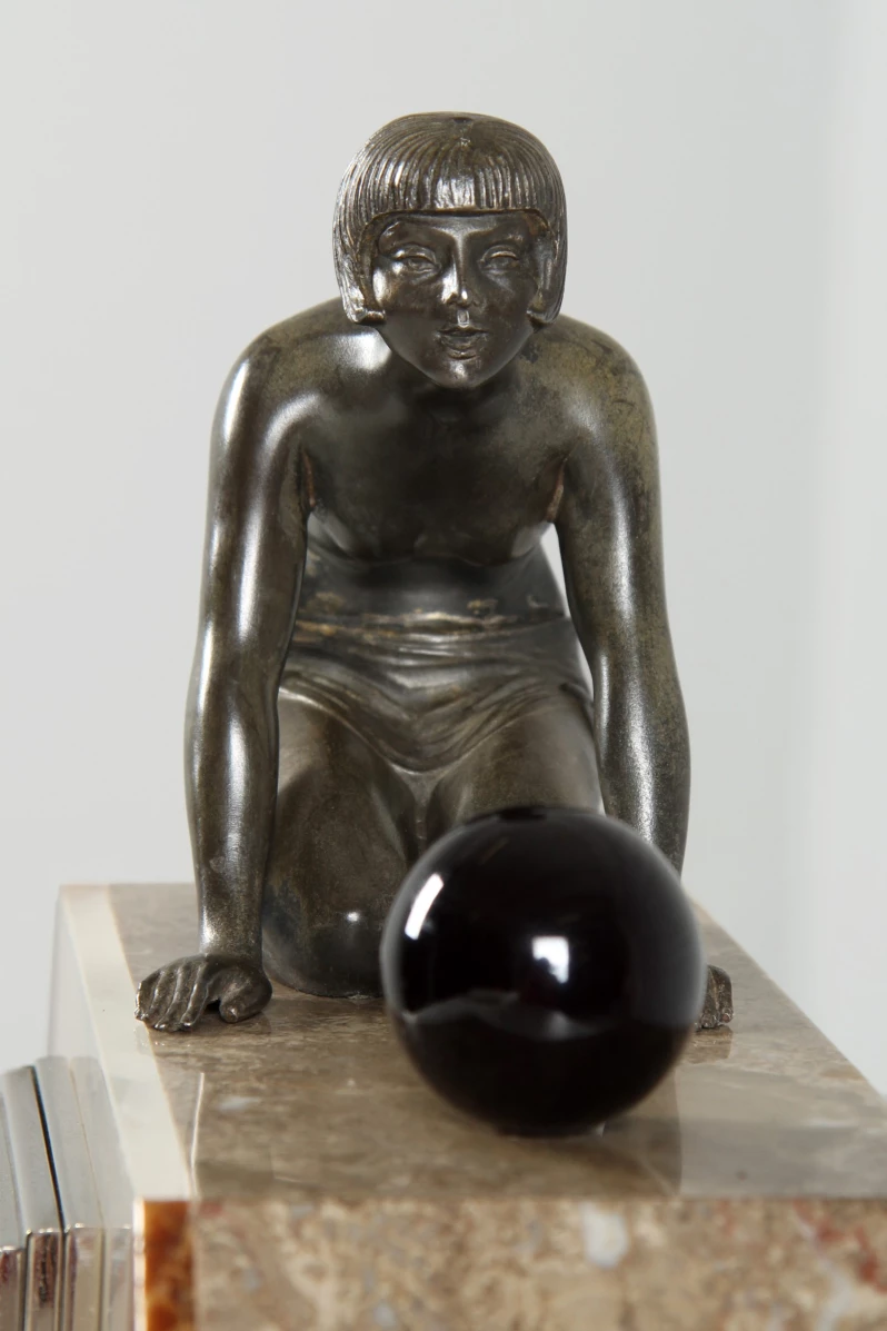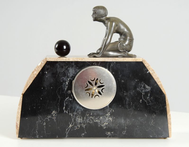 Das Gehäuse besteht aus cremefarbenem und braunem Marmor mit polierten Frontflächen und klaren geometrischen Kontrasten. Gekrönt wird die Uhr von einer fein modellierten Statuette - einer knienden Tänzerin mit Kurzhaarschnitt, neben der eine schwarze Kugel liegt. Diese charakteristische Szene der 1920er-Jahre ist inspiriert vom damaligen Ideal der modernen Frau, die in einer Zeit des gesellschaftlichen Wandels für Eleganz, Emanzipation und Selbstbestimmung steht. Der weibliche Körper wurde nicht länger klassisch idealisiert, sondern in Bewegung, Sport und Tanz neu inszeniert
