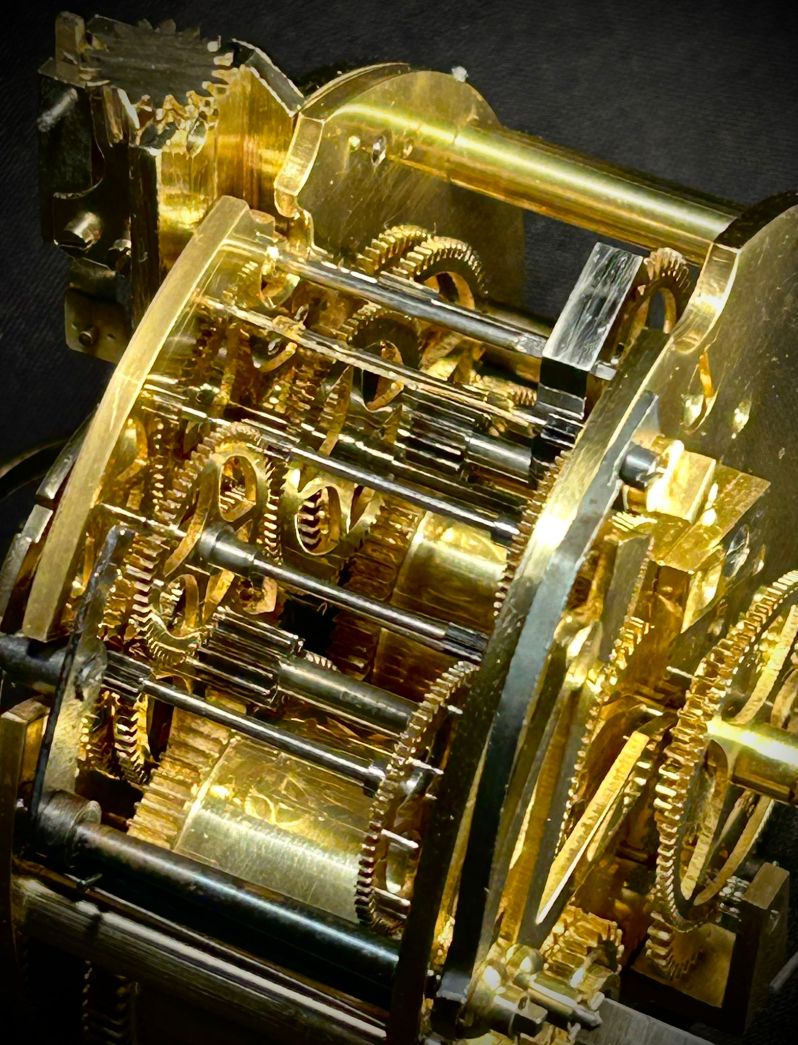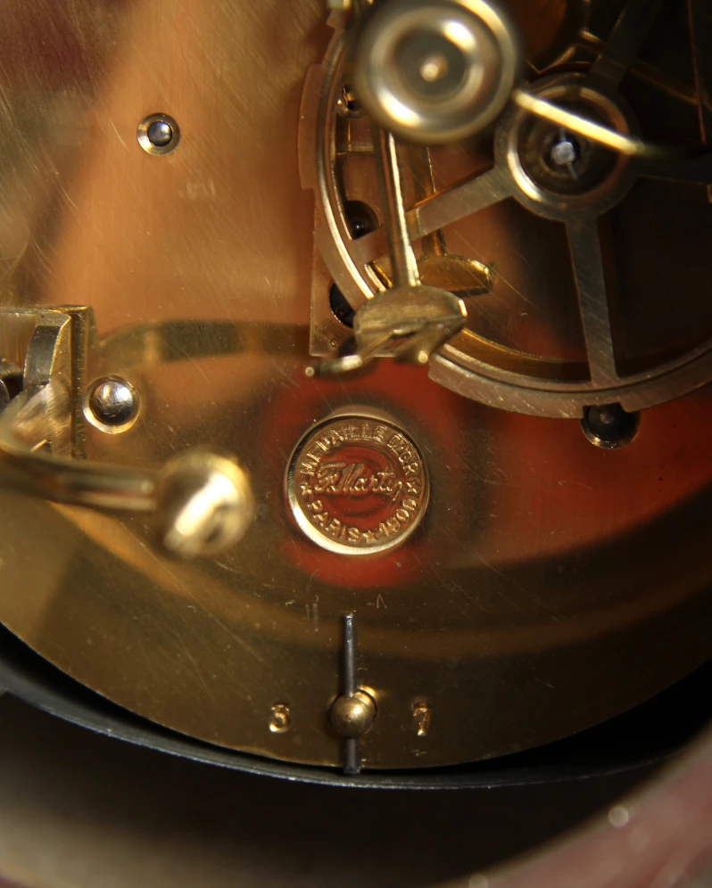 Öffnen wir den Scharnierdeckel auf der Rückseite, so sehen wir das originale Pendulenwerk aus der Manufaktur Marti, einem der bedeutendsten französischen Uhrwerkehersteller des späten 19. und frühen 20. Jahrhunderts. Marti belieferte zahlreiche Gehäusehersteller mit qualitativ hochwertigen Uhrwerken. Die Auszeichnung „MEDAILLE D’OR“, wurde Marti auf der Pariser Weltausstellung 1900 verliehen und wurde auf Uhrwerke bis weit in die Zwischenkriegszeit geprägt.
