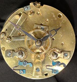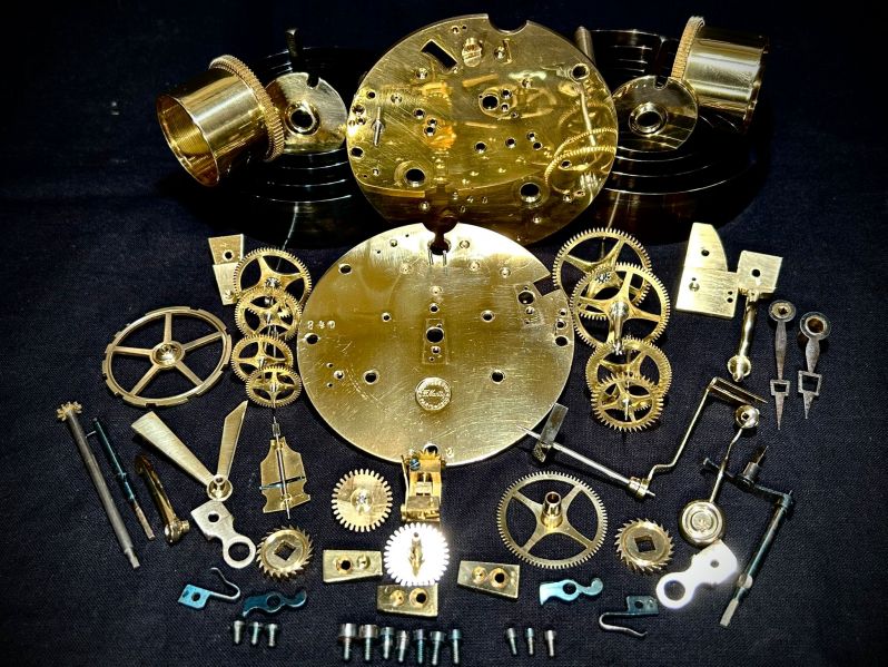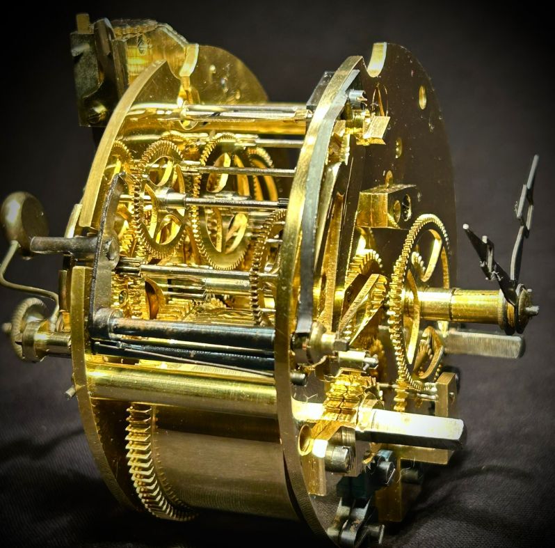 Die Uhr läuft 8 Tage bei vollem Aufzug und schlägt halbstündlich auf eine Glocke.