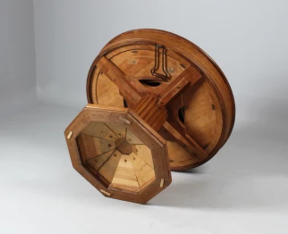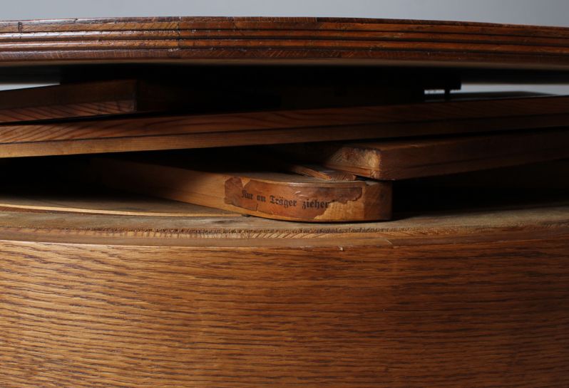 Mittels eines ausgeklügelten Mechanismus wird zunächst die Zarge über ein Gewinde herunter gedreht. Nun können acht Segmente, die sich passend um den Tisch legen, heraus gedreht werden.