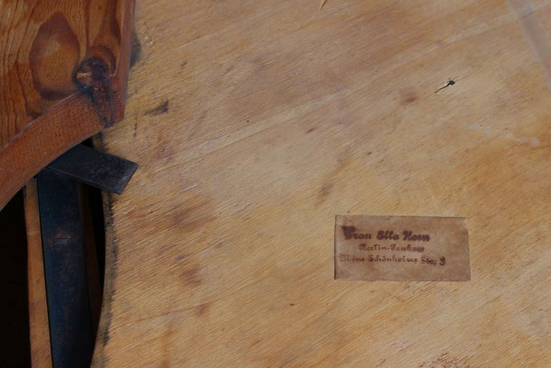 Auf der Unterseite des Tisches befindet sich ein altes Besitzer-Etikett: