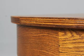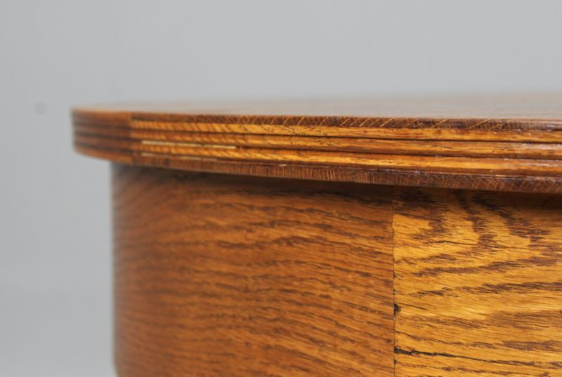 Der Tisch steht auf einem stabilen, runden und kannelierten Mittelfuß. Die verwendete Holzart ist Eiche, teils massiv, teils auf Nadelholz furniert.