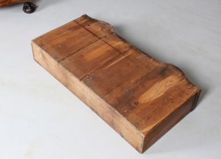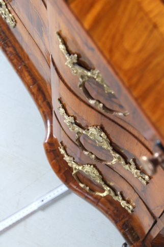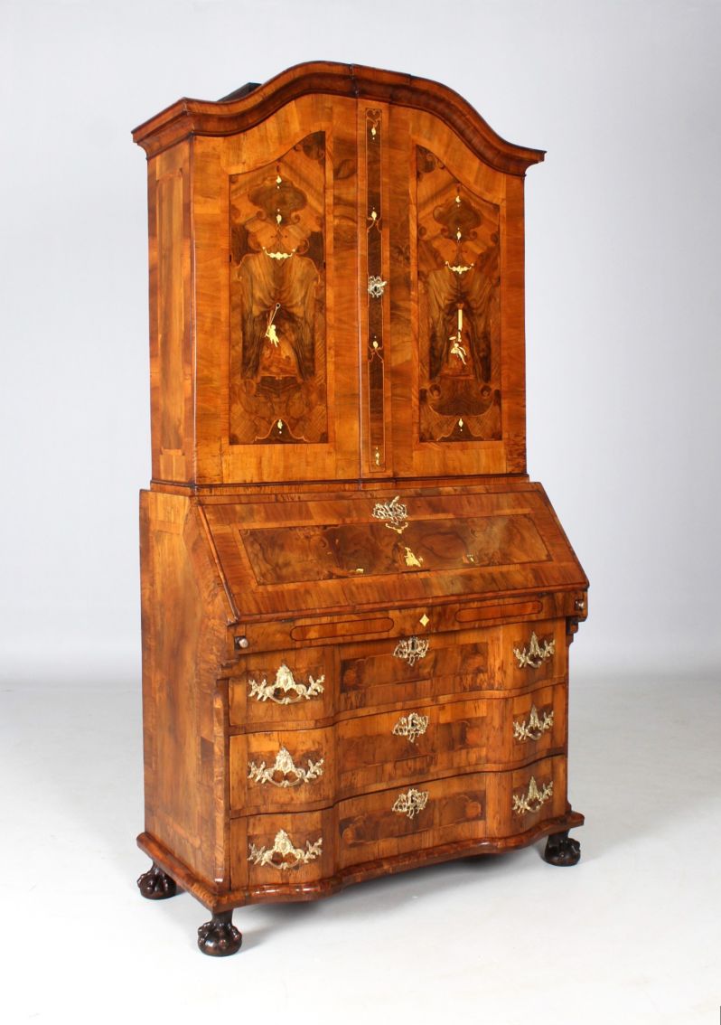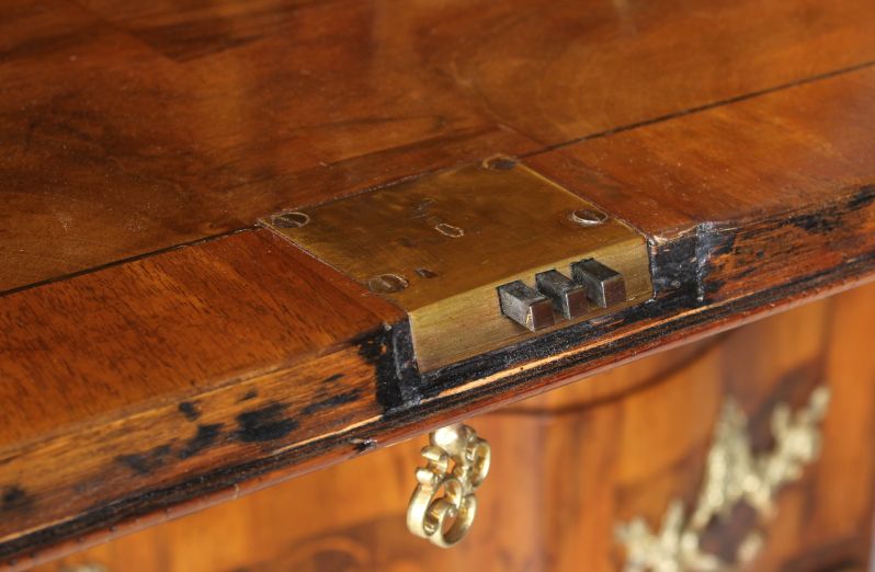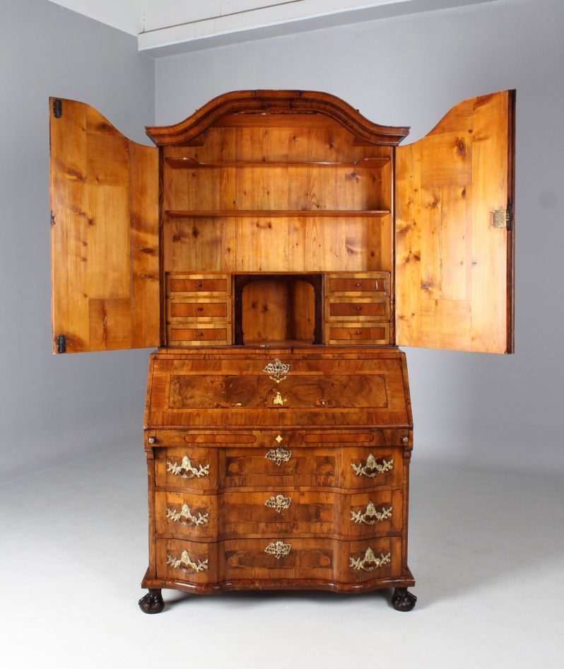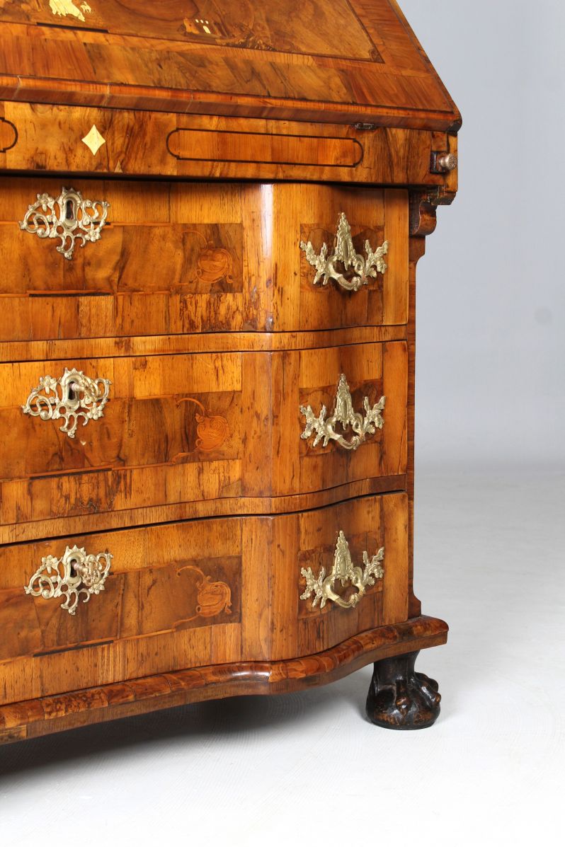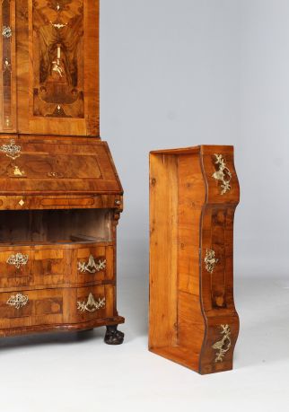 Der untere Teil besteht aus drei großen Schubladen und der darüber befindlichen Schrägklappe. Typisch für die Braunschweiger Bauweise ist, dass die Schubladen zwar recht stark geschwungen sind, das Schreibteil aber geradlinig darauf aufbaut und somit nicht der Form des Sockels folgt. Da es hier keine Platte gibt, auf der die Schreibklappe aufliegen kann, wird die Arbeitsfläche von zwei ausziehbaren Leisten gestützt. Auch das ist typisch für die Gegend, einige schöne Vergleichstypen finden Sie bei [Wolfgang Eller - Schreibmöbel von 1700-1850 ab S. 215].