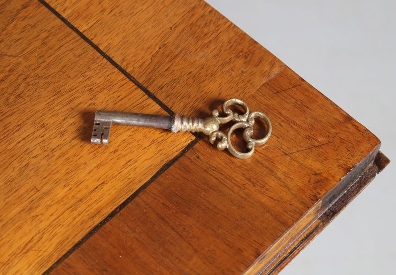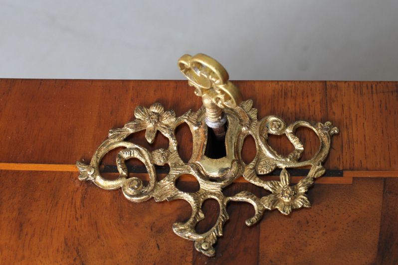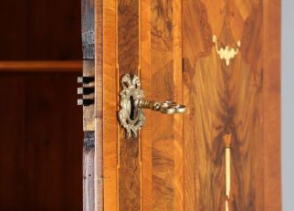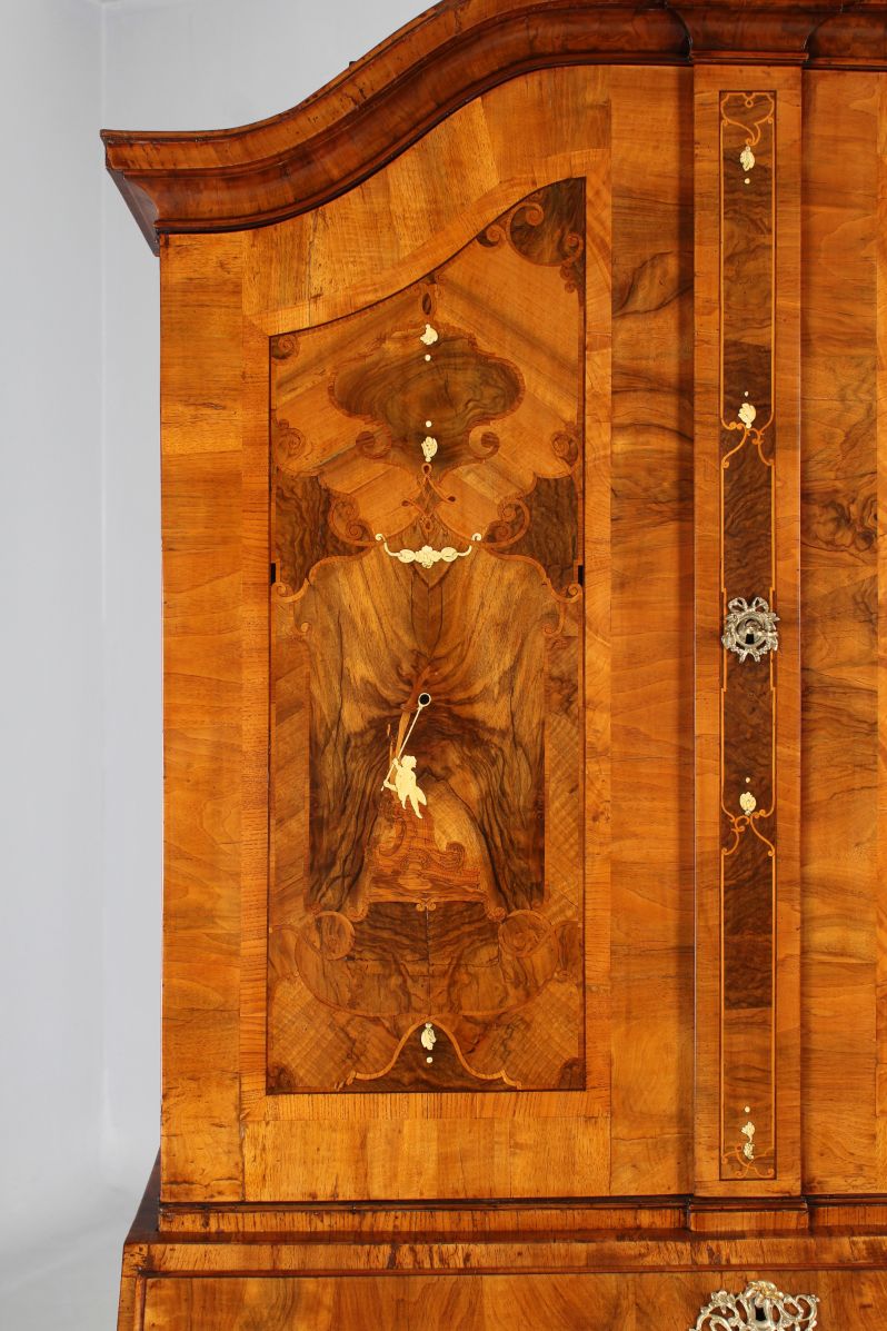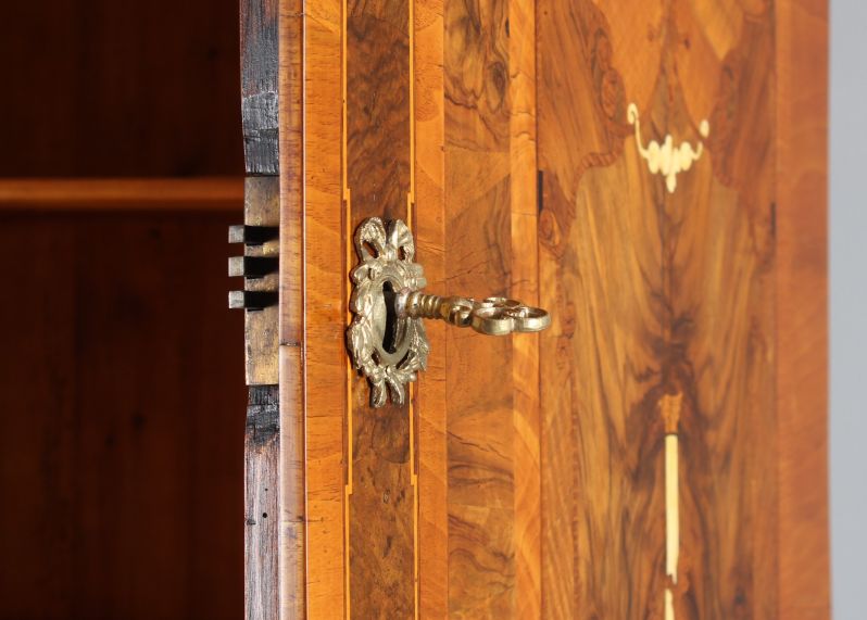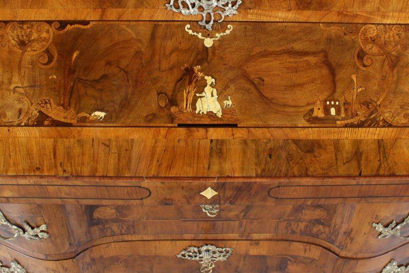Das Möbelstück ist in Nussbaum furniert mit aufwendigen Marketerien aus Esche, Ahorn, Mooreiche und Elfenbein.