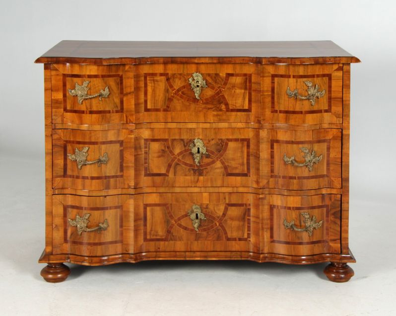 Auf Quetschfüßen stehende dreischübige Kommode mit geschwungen und geknickt ausgestalteter Möbelfront.