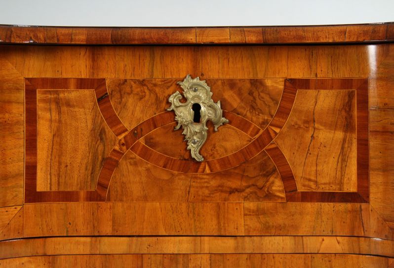 Sauber gegossene Bronzebeschläge mit den typischen C-Schwüngen, Rocaillen und Akanthus-Blattwerk komplettieren die Frontansicht des Möbels.