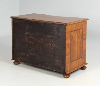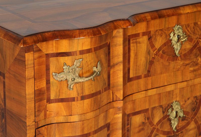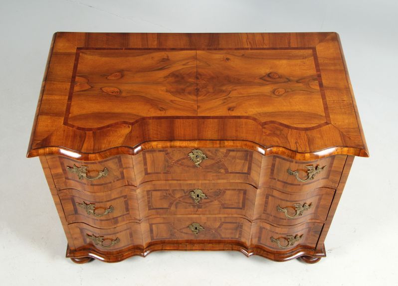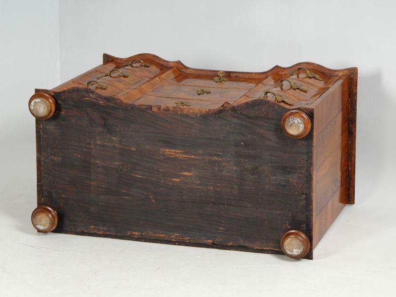 Interessant ist die Deckplatte mit dem in perfekter Symmetrie verlegtem Nussbaum Furnier. Die Voderkante der Platte ist, wie die Sockelleiste auch, zeit- und regionstypisch aus aneinandergereihten Hirnholzstücken ausgeführt. In Ihrer Form folgt die Kante dem Verlauf der Möbelfront.