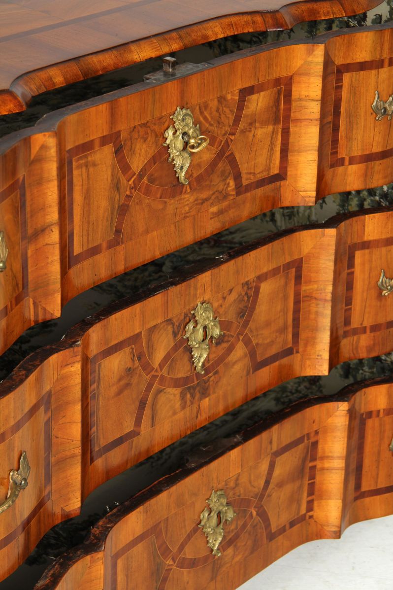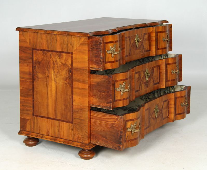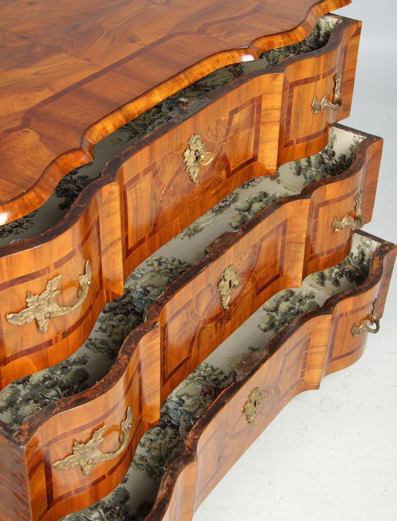 Die Schubladen sind zum Einen durch die Schweifung in je drei Bereiche gegliedert, zum Anderen auch durch die streng geometrischen Marketerien aus Pflaumenholz, die von Ahornfäden begleitet werden.