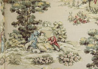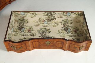 Die Schubladeninnenseiten sind mit einem späteren, sorgfältig angebrachten Toile-de-Jouy-Stoff mit ländlichen Genreszenen ausgeschlagen.
