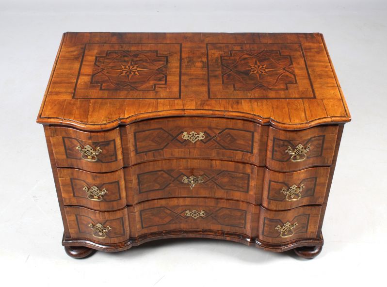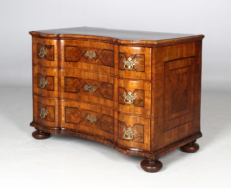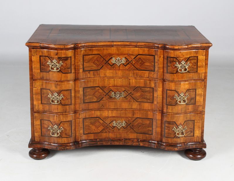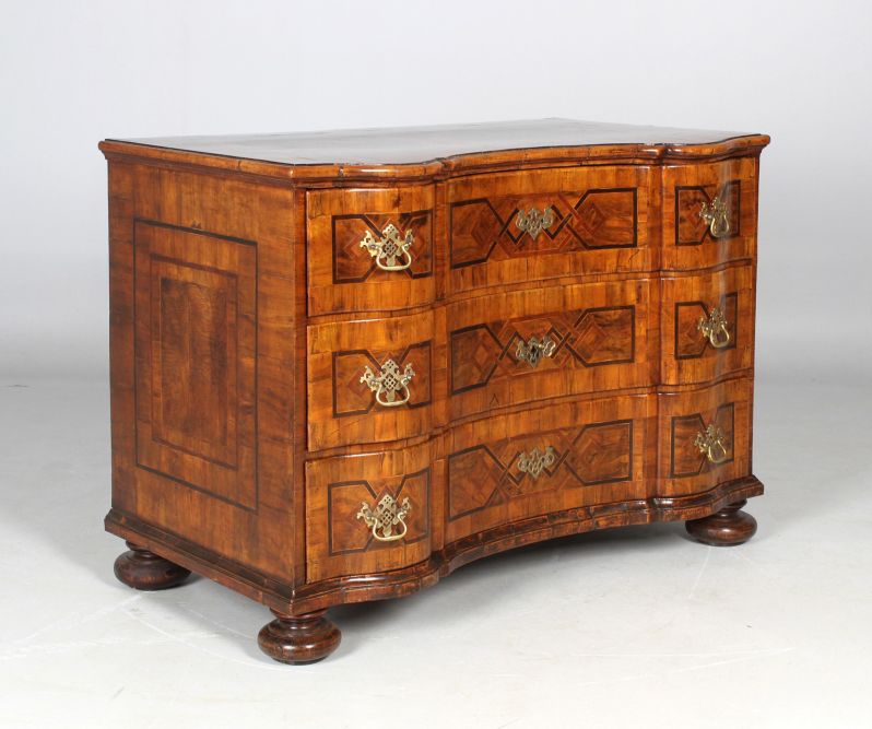 Auf Quetschfüßen stehende dreischübige Kommode mit geschwungen und geknickt ausgestalteter Möbelfront.