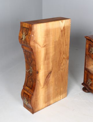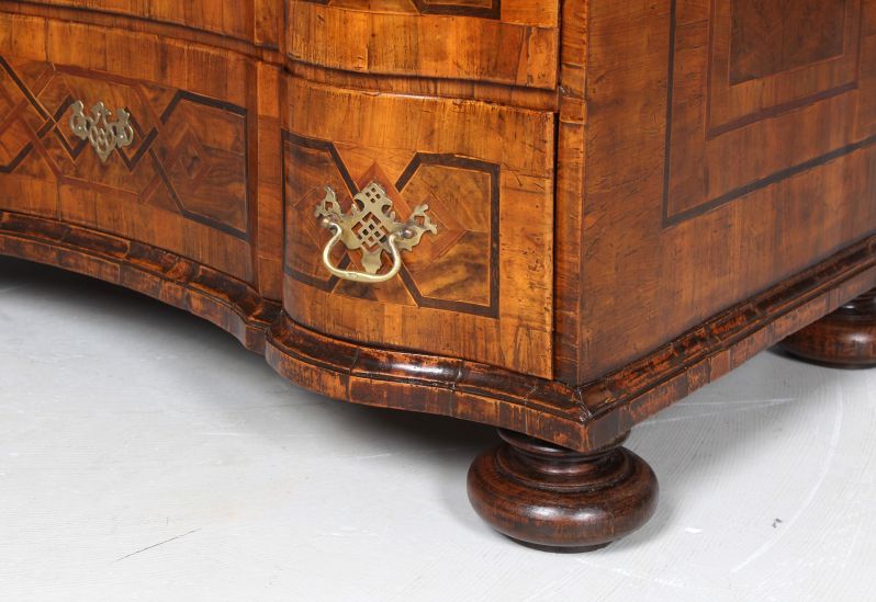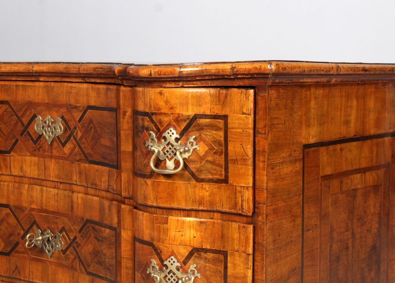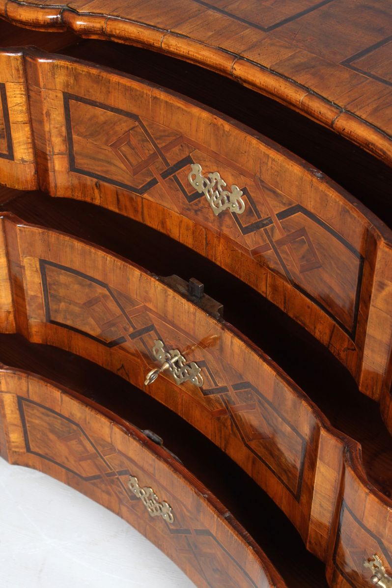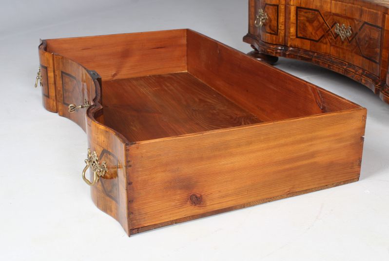 Die Schubladen sind zum Einen durch die Schweifung in je drei Bereiche gegliedert, zum Anderen auch durch die streng geometrischen Marketerien aus Pflaumenholz und Mooreiche, die je durch Ahornfäden eingefasst sind.