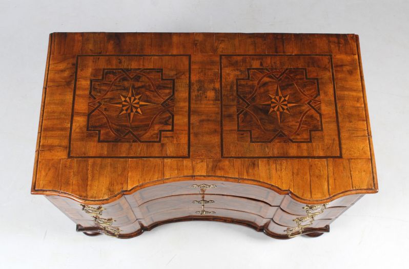 Interessant ist auch die Deckplatte mit ihren dominanten Faltsternen aus hell-dunkel kontrastierenden Hölzern. Die umliegenden Einlegearbeiten sind in ähnlicher Manier ausgeführt wie die der Möbelfront.
