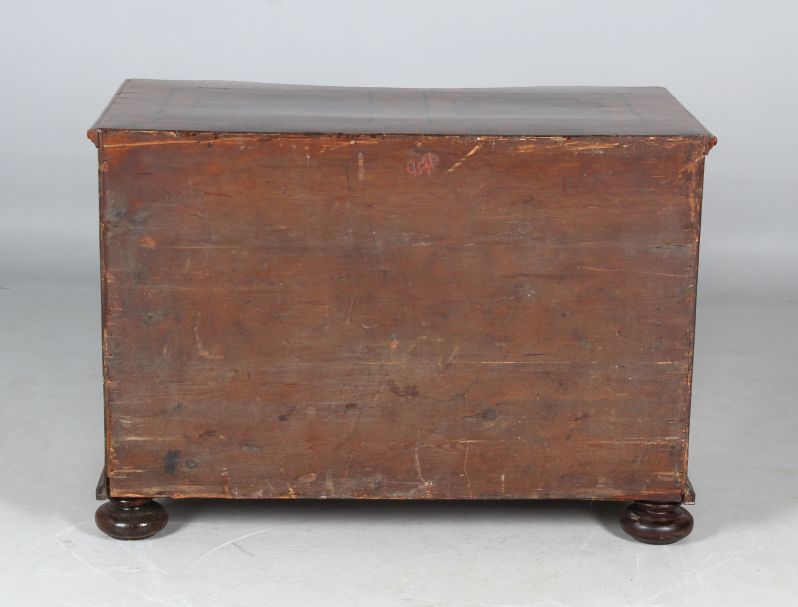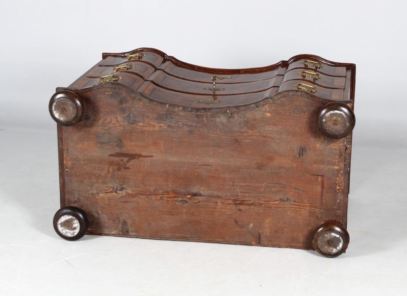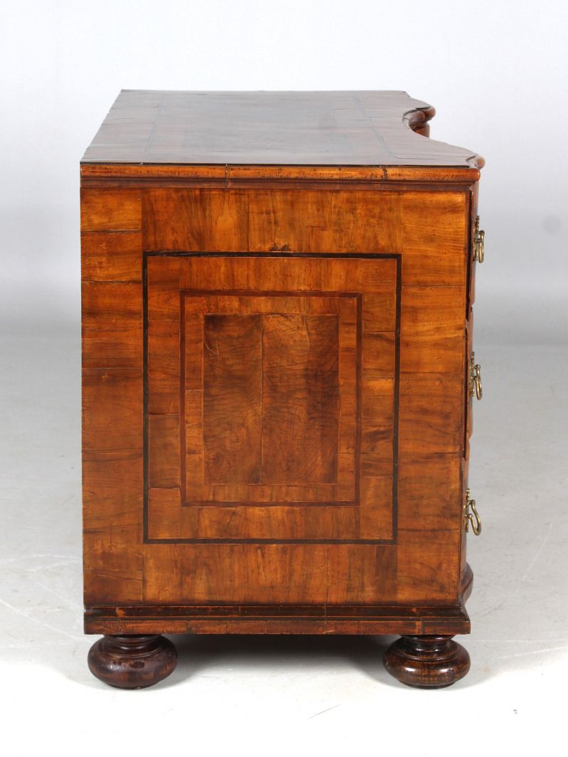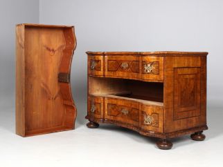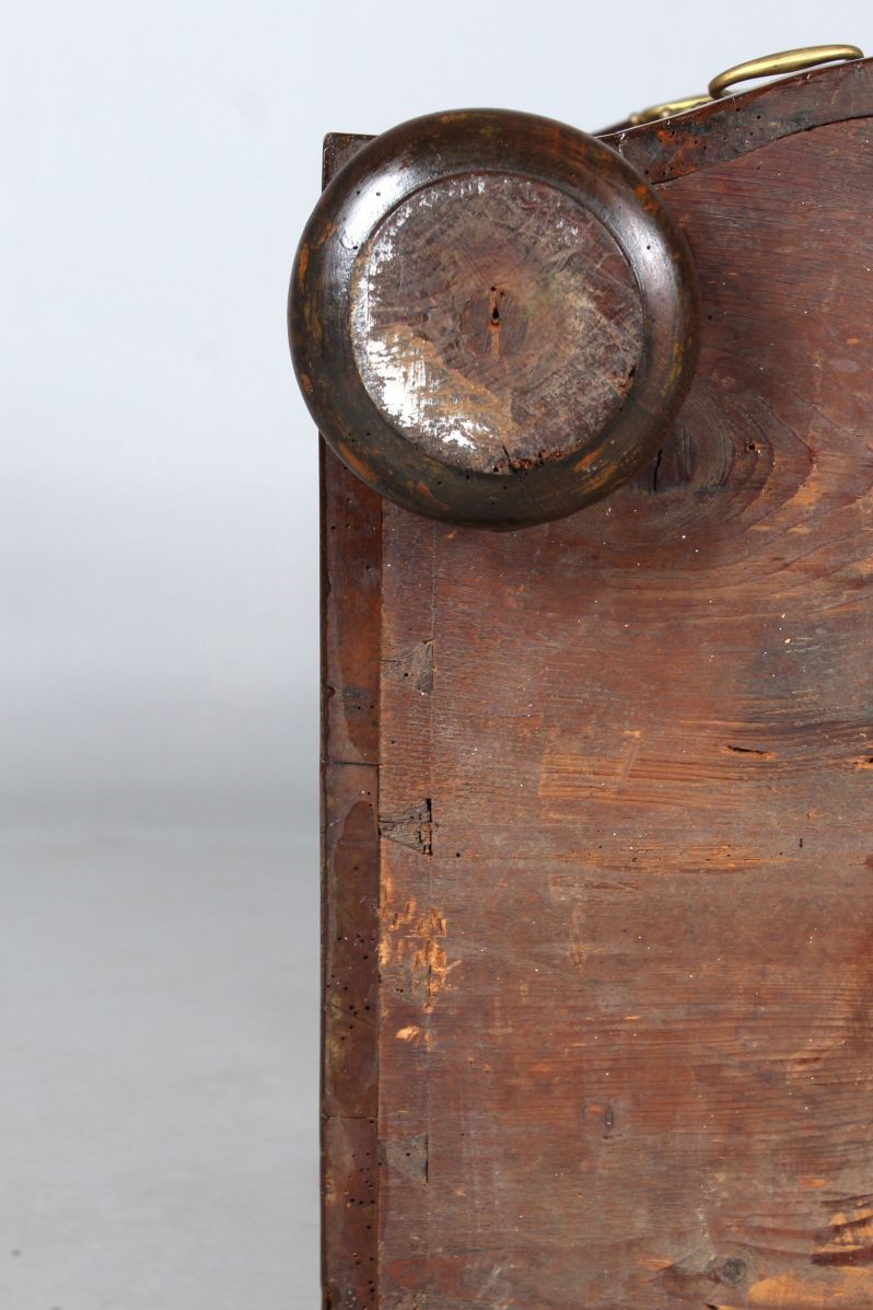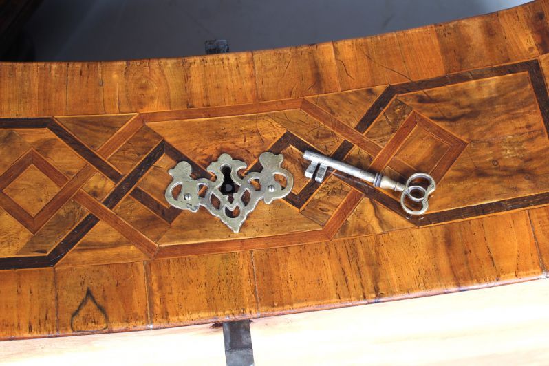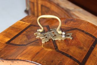 Die Beschläge entsprechen der Entstehungszeit des Möbels, sind aber später ergänzt worden. Original und absolut beeindruckend ist das große Kastenschloss in der mittleren Schublade, das nach oben und unten schließt und somit alle drei Schubladen verriegelt.