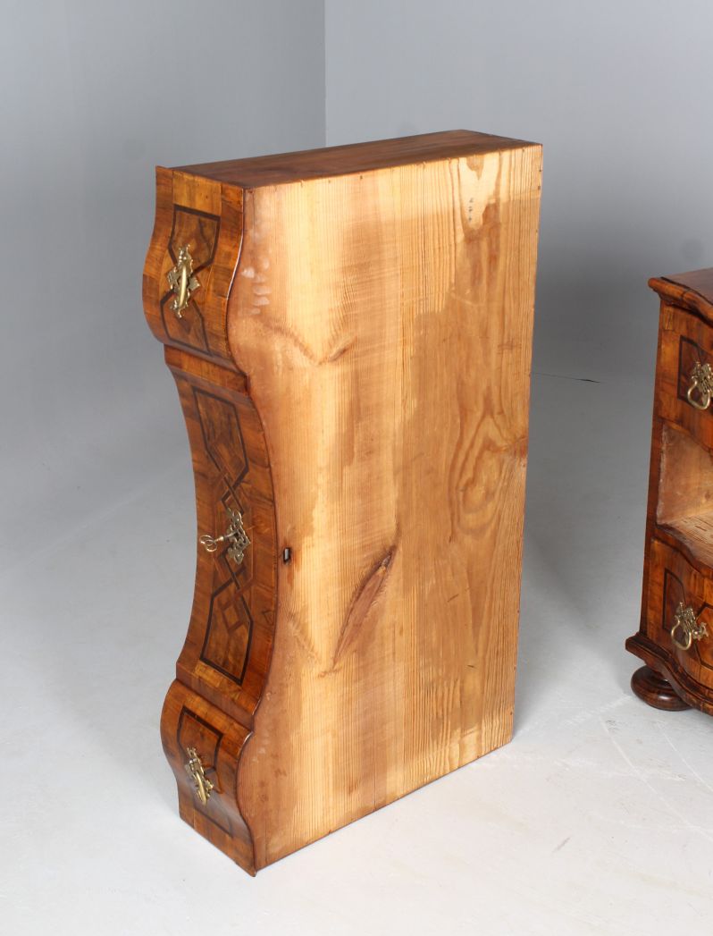 Gelöste Furniere sind niedergeleimt und gefestigt. Die vorhandene Schellackpolitur wurde sanft gereinigt und aufgefrischt. Die Schubladen laufen sauber und flüssig, das Schloss funktioniert einwandfrei. Es gibt zahlreiche konservierte Alters-und Nutzspuren, schauen Sie sich hierzu bitte die Detailfotos an.
