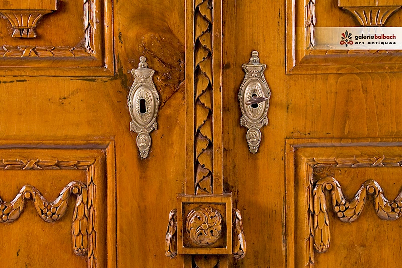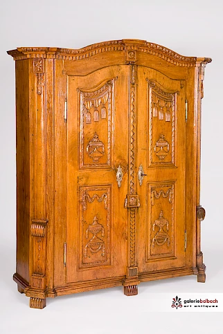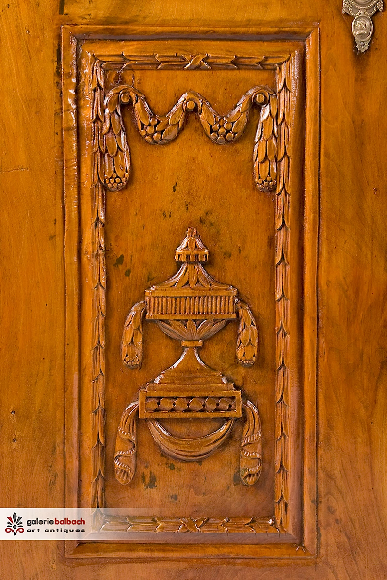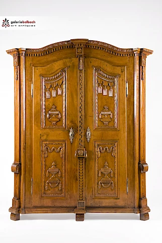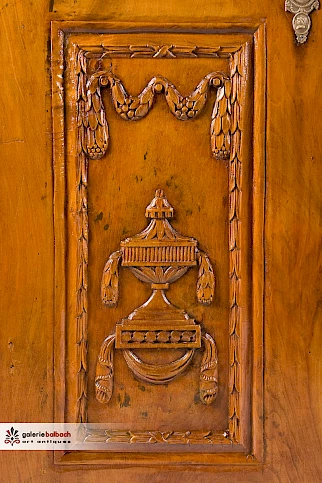 Füllungen reichhaltig beschnitzt mit Fruchtfestons und Quastengirlanden, sowie auf Konsolen stehenden Urnenvasen. Gerahmt werden die Füllungen mit oben in Voluten endender Floralschnitzerei.