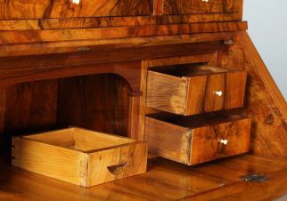 Bei geöffneter Schreibklappe sehen wir vier Schubladen rechts und links eines offenen Faches. Oberhalb dieser Schubladen und nur von innerhalb des Faches zu sehen und zu öffnen, befinden sich zwei versteckte Schübe.