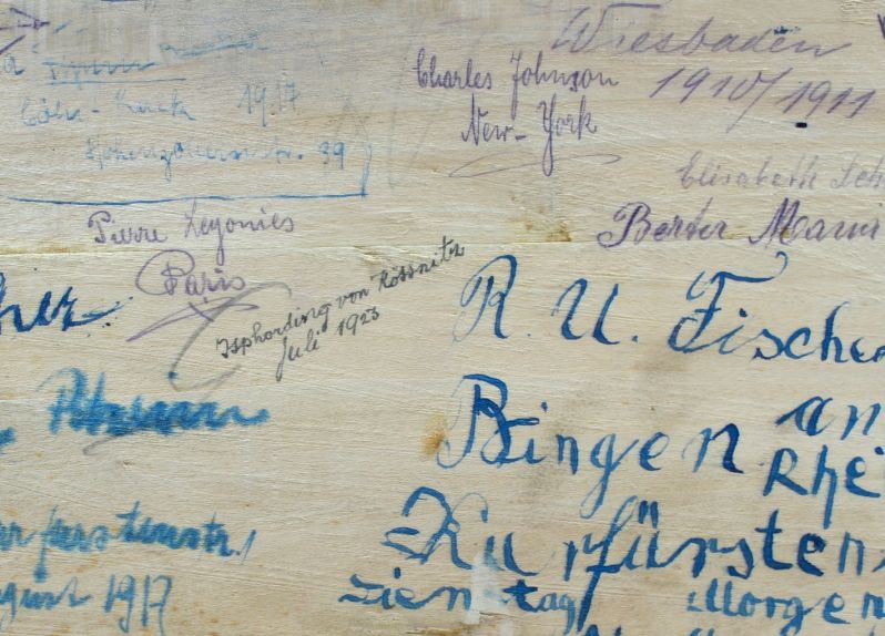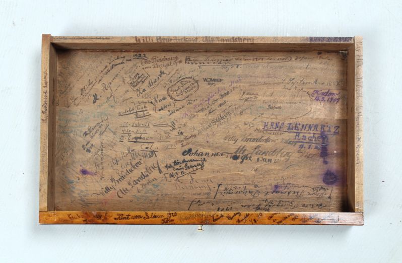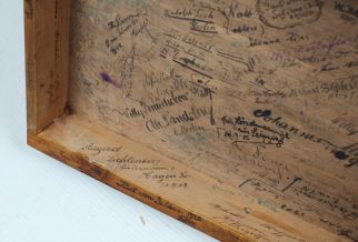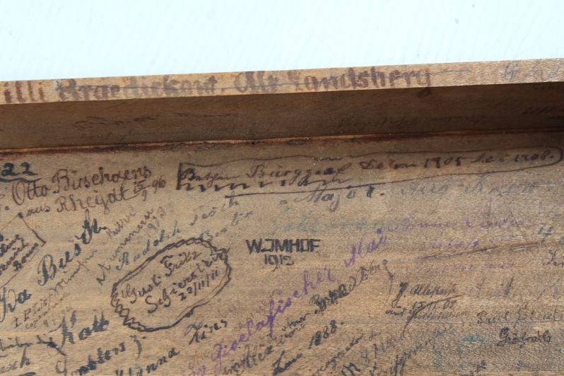 Man sagt "Narrenhände beschmieren Tisch und Wände..." In diesem Fall jedoch tragen die vielen Inschriften meiner Meinung nach zu dem besonderen Charme des Möbelstückes bei und sind doch auch eine ganz eigene Art von Patina!