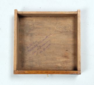 Den Kopfabschluss bildet eine Reihe aus drei Schubladen. Diese drei Schubladen sind innen, teils auch unten und auf den Seiten mit unzähligen Signaturen beschriftet.