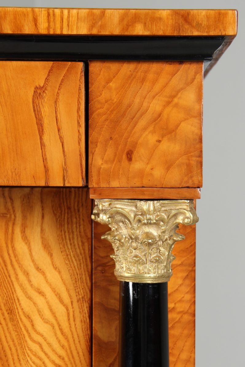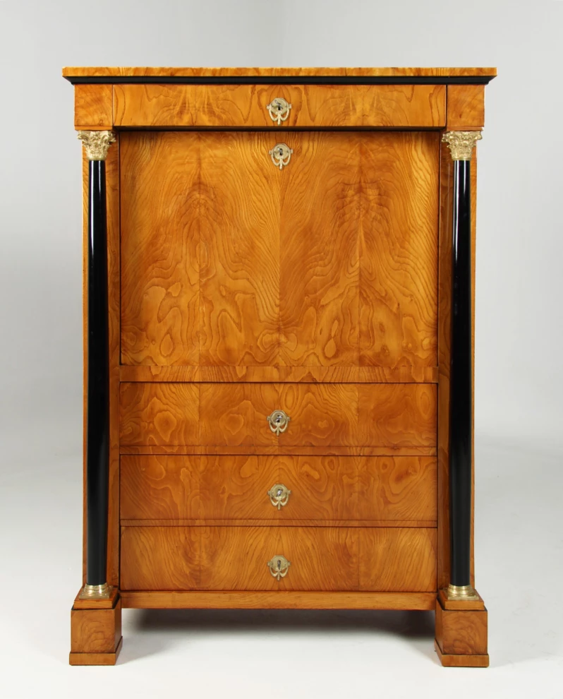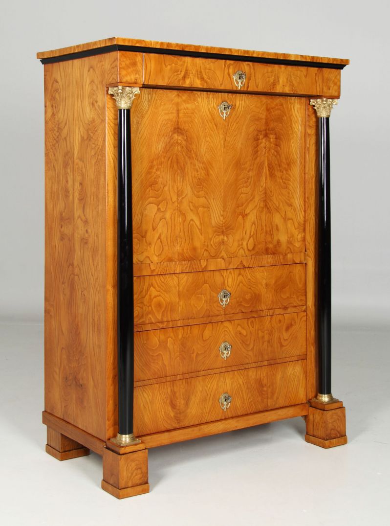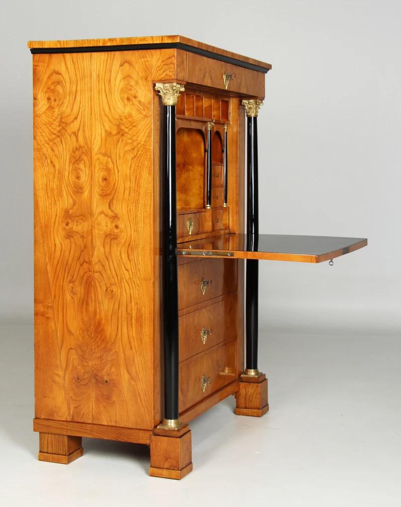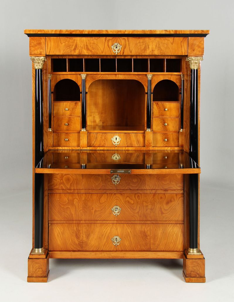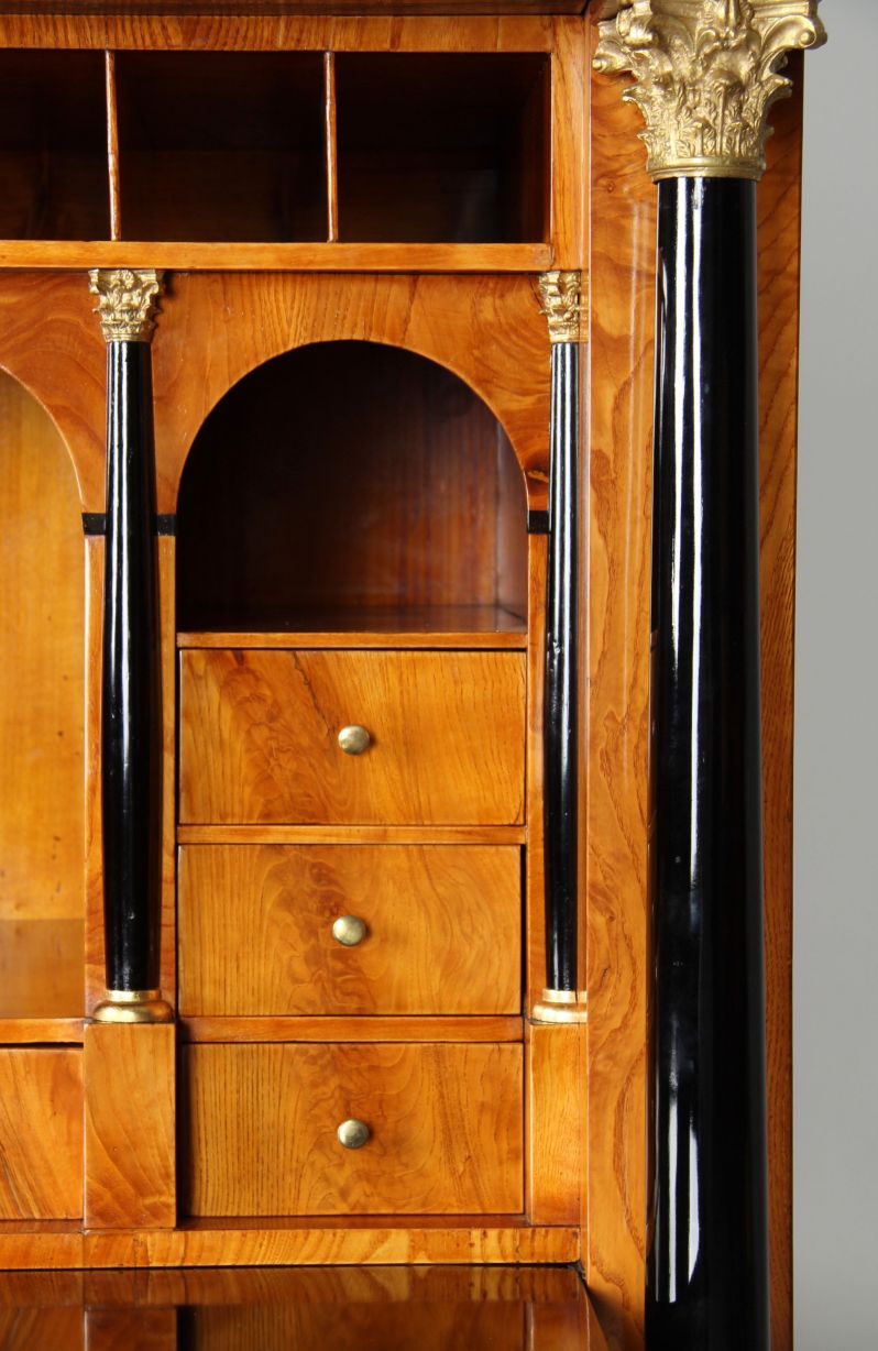 Auf gesockelten Quaderfüßen stehendes Schreibmöbel mit drei Schubladen unten, der Schreibklappe darüber und einem Kopfschub ganz oben. Die Ebene des Kopfschubes steht über den Rest des Möbelkorpusses heraus und wird von zwei ebonisierten Säulen mit Messingbasen und -kapitellen gestützt.