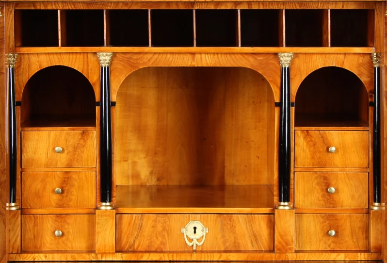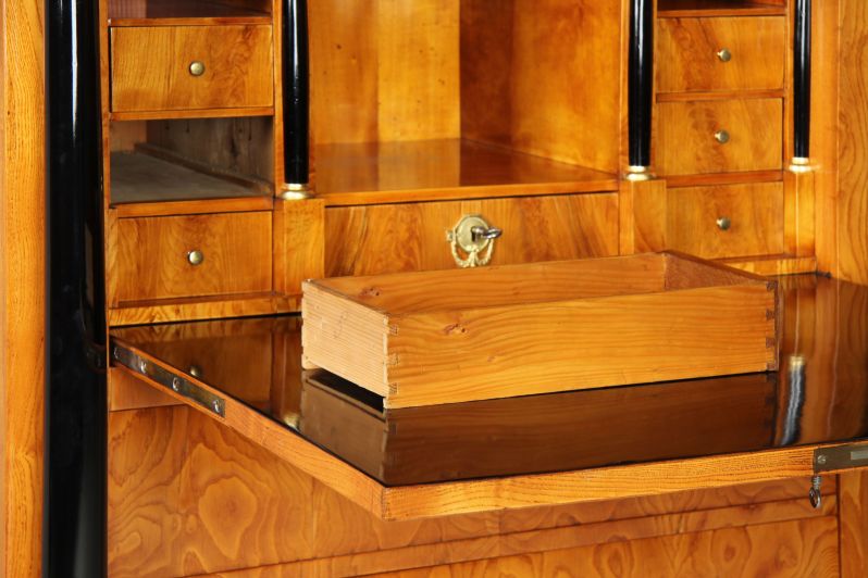 Öffnen wir die Schreibklappe so offenbart sich ein interessant gestaltetes Innenleben mit sieben Schubladen und drei offenen Fächern unter Rundbögen. Darüber befindet sich eine vielfächige Briefablage, gestützt von vier kleinen Säulen, die das Eingerichte vertikal gliedern. Die Schreib- und Arbeitsfläche ist schwarz poliert.