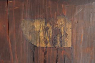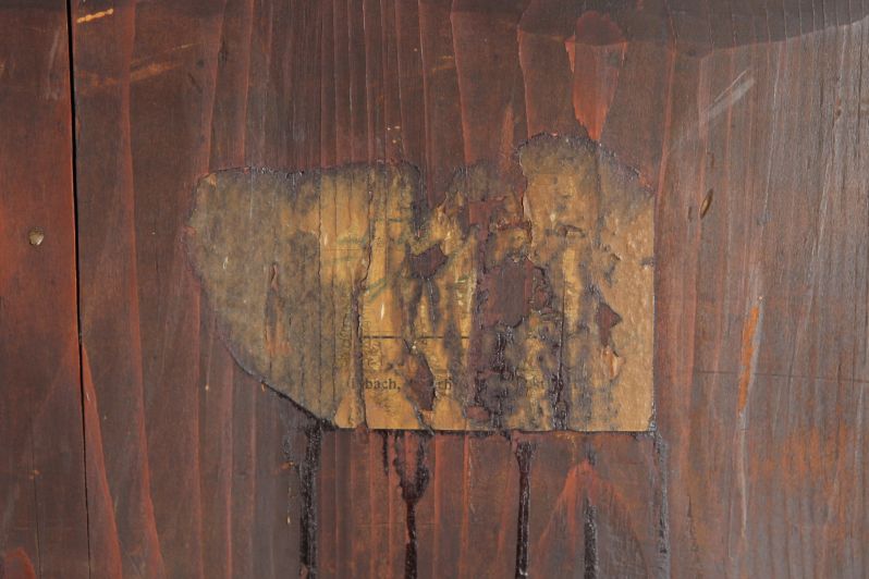 Auf der in Rahmenbauweise konzipierten, zweiteiligen Rückwand des Möbels befindet sich ein altes, unleserliches Versandetikett.