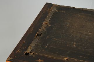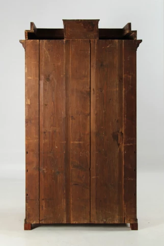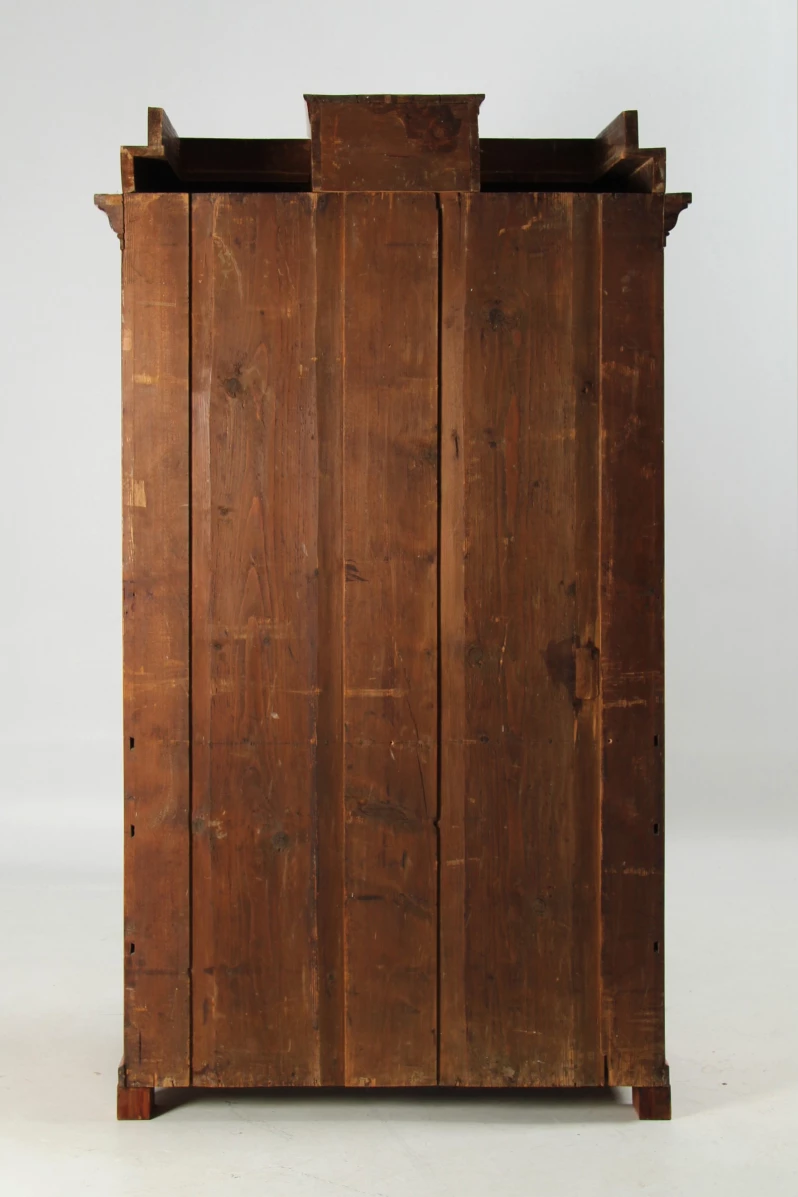 Der dreiteilige Aufsatz, bestehend aus den beiden treppenartig aufgebauten Seitenpartien und dem Mittelteil mit Schublade, ist abnehmbar. Dadurch reduziert sich die Gesamthöhe des Möbelstücks auf etwa 170 cm.
