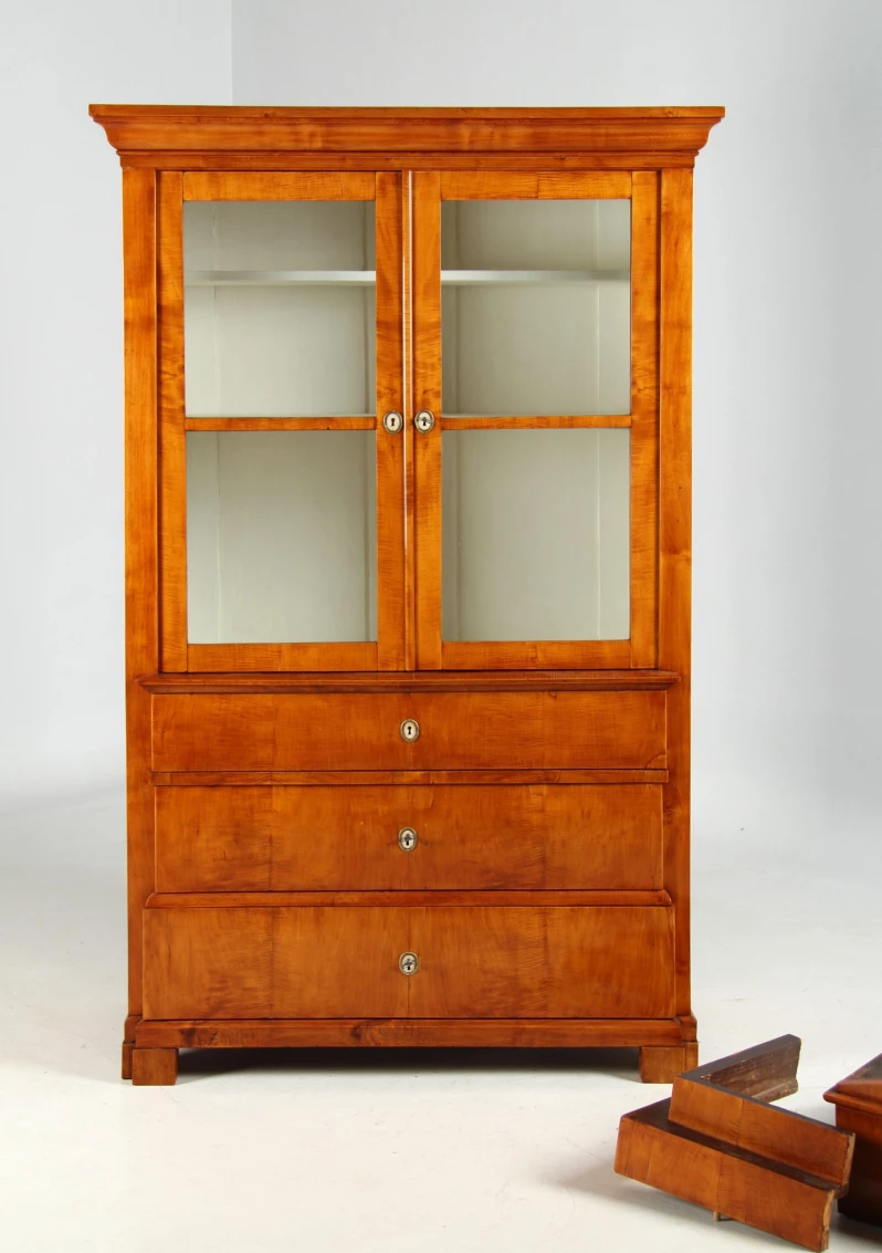 Antiker Biedermeier-Bücherschrank mit drei breiten Schubladen im unteren Bereich, darüber zwei verglasten Türen sowie einem gestuften Aufsatz mit schmalem Schinkelgiebel und einer dieser Breite entsprechenden Schublade.
