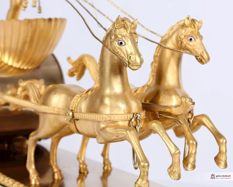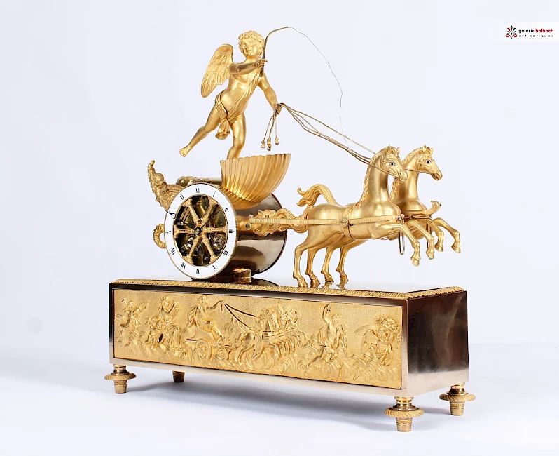Auf rechteckigem Sockelkasten montierte Darstellung des geflügelten Amor, der triumphierend die zweispännige Biga lenkt.