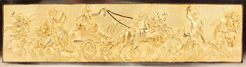 Auf dem Sockelrelief sehen wir Apollo, der in seiner vierspännigen Kutsche durch den Himmel fährt. Zu seinem Gefolge gehört Merkur der Götterbote und eine schreibende Muse. Ebenfalls Teil des Triumphzuges sind zwei Putti, der eine einen Fruchtkorb-, der andere einen Lorbeerkranz tragend.