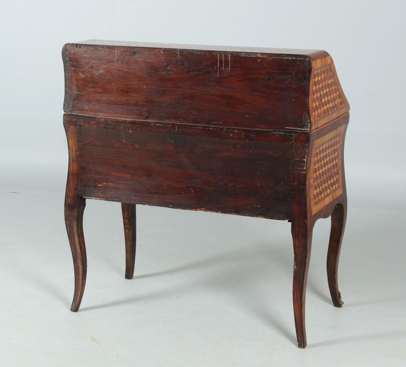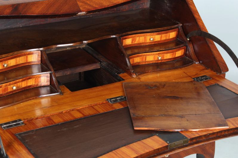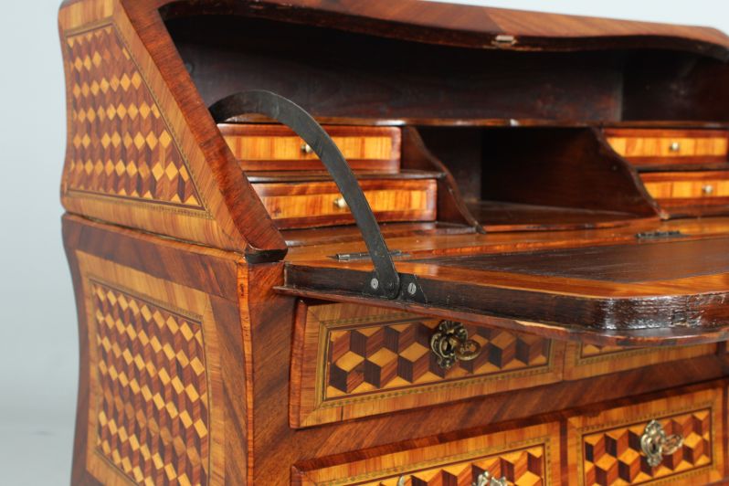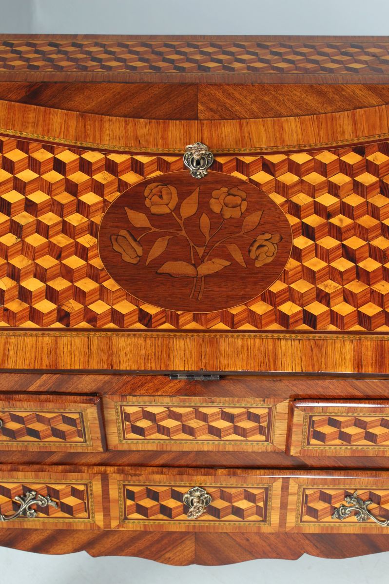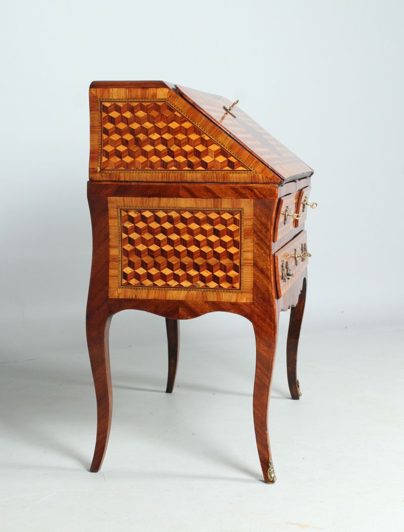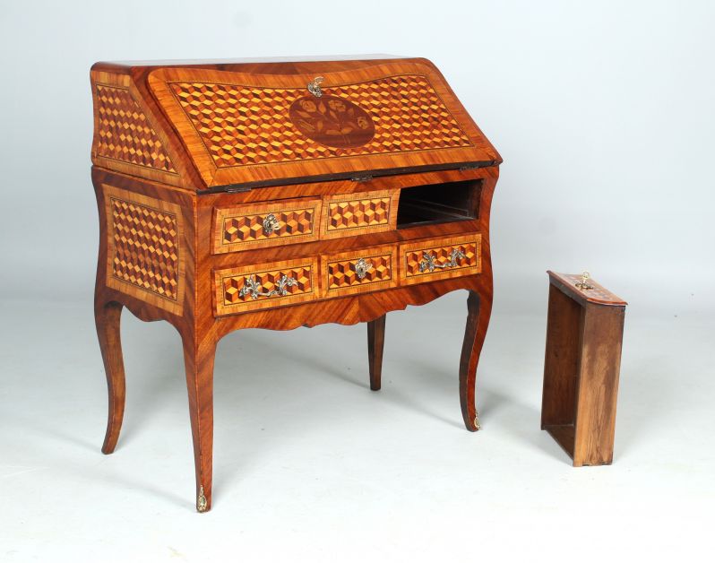 Beeindruckend schöner und mit feinsten Hölzern marketierter Schrägklappen-Schreibtisch, sog. Secretaire en Pente.