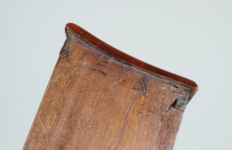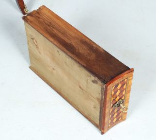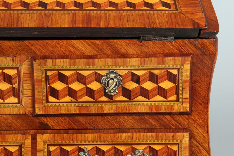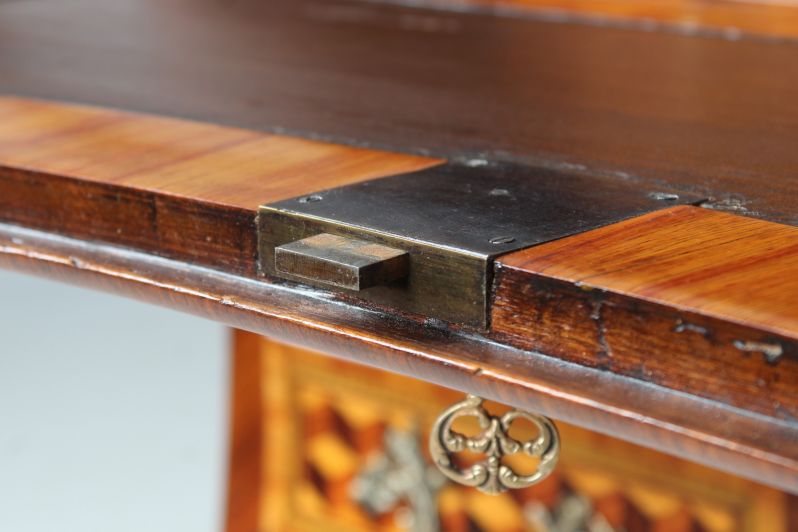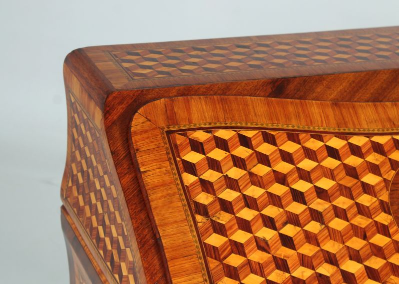 Von Friesen und Fadenintarsien gerahmt, sehen wir Felder mit feinsten Würfelmarketerien. Durch die unterschiedlich farbigen Hölzer sowie die geschickt verlegten Maserungsverläufe bekommen die Einlegearbeiten eine unglaubliche Tiefe und Dreidimensionalität. Die Schellackpolitur befeuert diesen einzigartigen Charakter.
