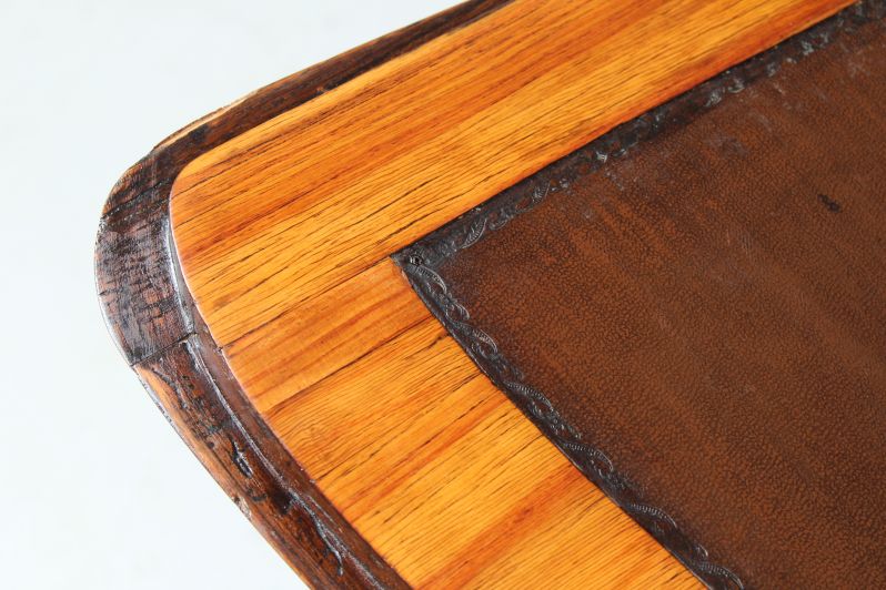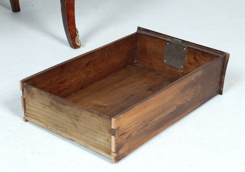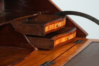 Frontseitig befinden sich unten eine breite Schublade, darüber, außen je eine schmale Schublade und oben die aufklappbare und von Eisenscharnieren gehaltene Schrägklappe. Die durch das Öffnen entstandene Arbeitsfläche ist mit braunem, umlaufend geprägtem Leder belegt.