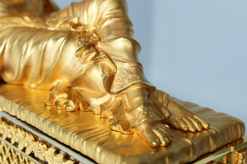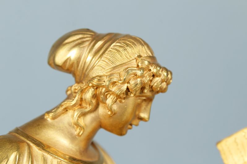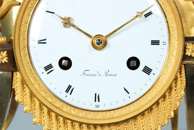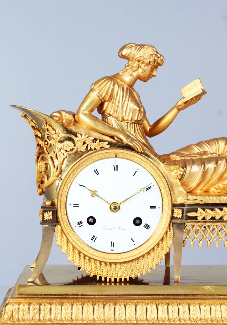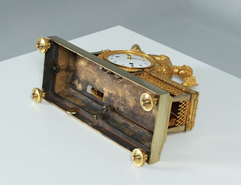 Ausgefallene und seltene feuervergoldete Kaminuhr aus der Zeit des Empire um 1810.