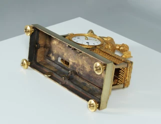 Die Feuervergoldung ist sehr gut erhalten. Das Werk wurde komplett zerlegt, fachmännisch gereinigt und revidiert. Insgesamt befindet sich die Uhr in einem sehr guten Zustand.