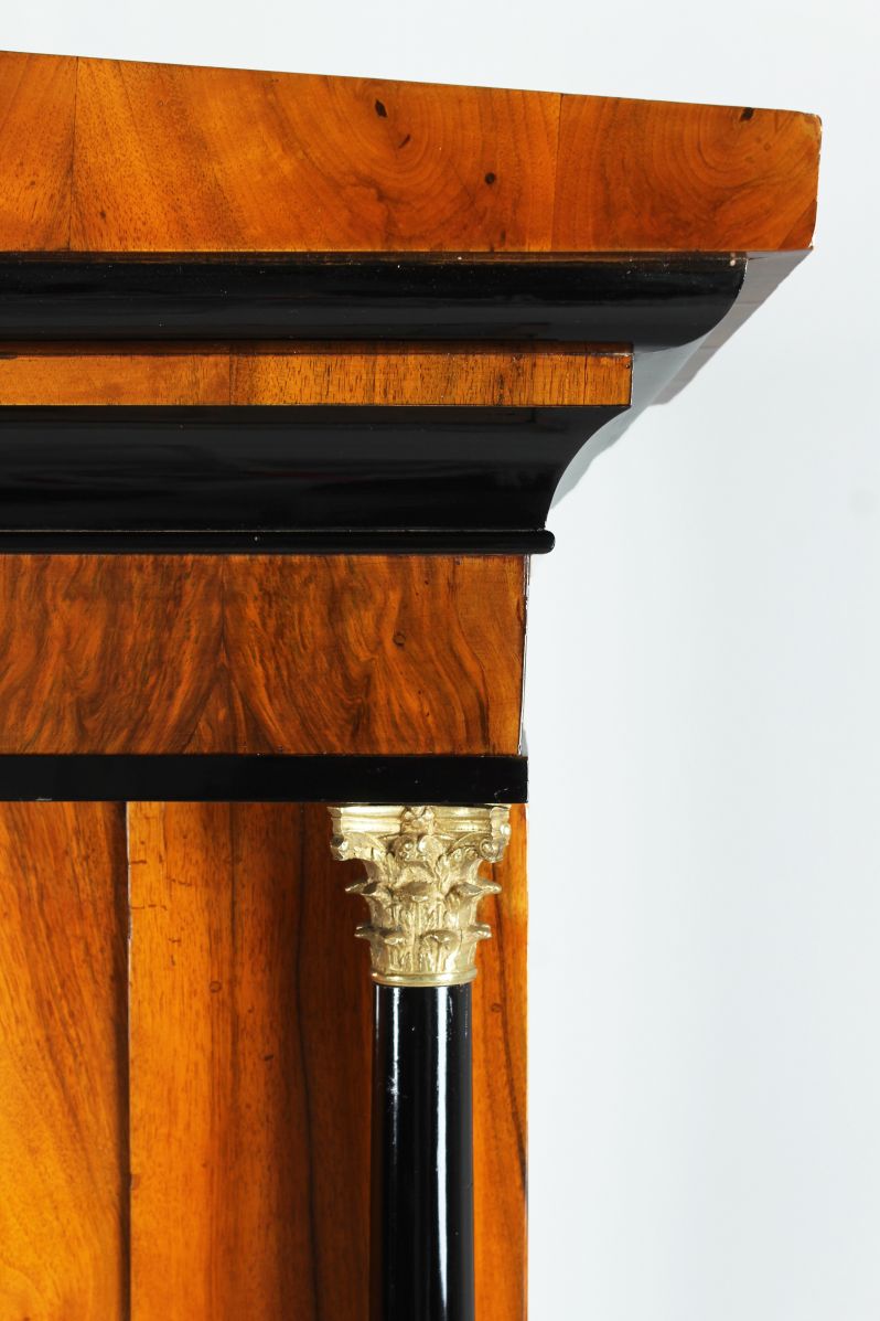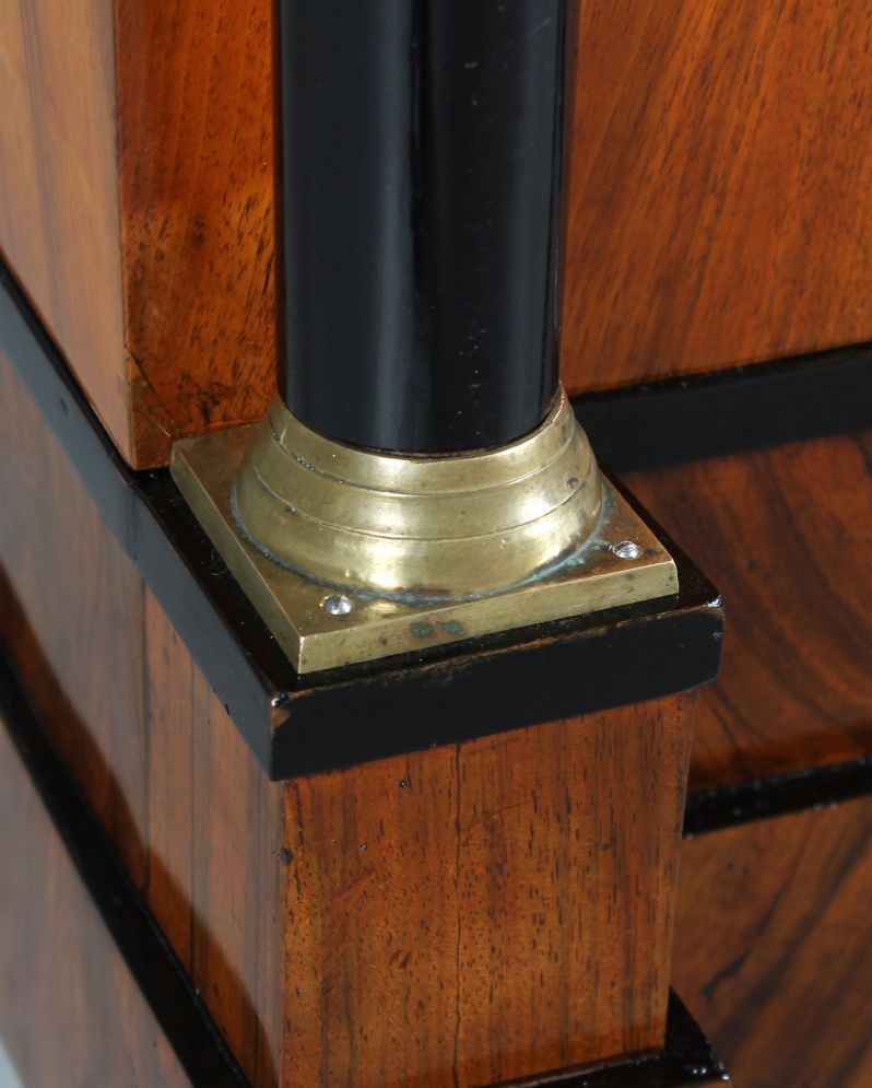 Auf gesockelten Vierkantfüßen stehende, zweietagige Sockelpartie. Die Füße springen risalitartig aus der eigentlichen Sockeltiefe vor und bilden nach oben die Aufnahme für die freistehenden Säulen. Diese flankieren das Möbel auf der vollen Höhe der Türen und schließen oben mit wunderbaren bronzenen Kapitellen ab.