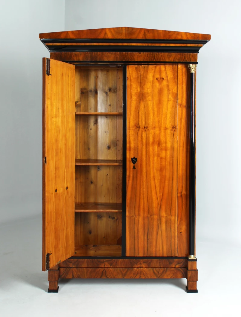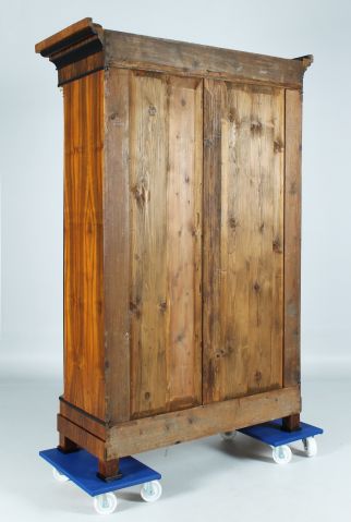 Absolut prägend in der Gestaltung des Schrankes ist das sowohl nach vorn als auch zu den Seiten weit überstehende Gesims, das mehrfach profiliert ist und nach oben in einem flachen Dreiecksgiebel endet.