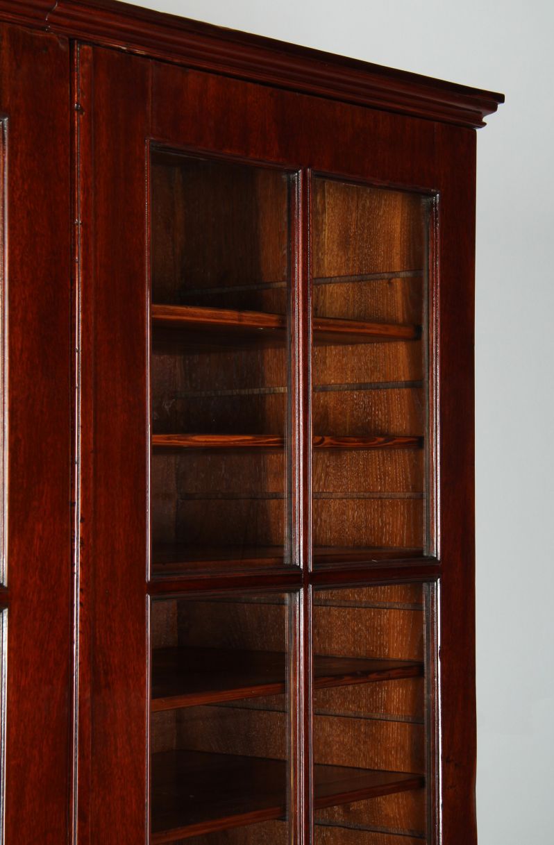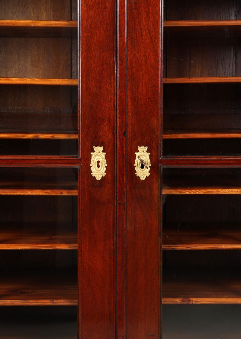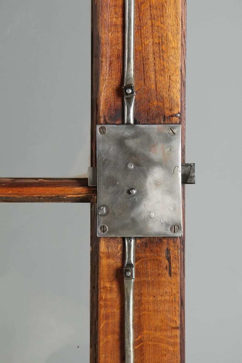 Die zwei Türen sind mit je acht Scheiben verglast. Die Versprossung ist in feinster handwerklicher Qualität ausgeführt. Von außen zeigt sich der Aufdopplungsrahmen, der die Sprossen begleitet, aus massivem Mahagoni, mehrfach profiliert und an den Ecken exakt auf Gehrung gearbeitet. Bei geöffneter Tür wird sichtbar, wie die nach außen spitz zulaufenden Elemente der Versprossung sauber in die Seiten- und Querstücke des Rahmens eingelassen sind. Die Glasscheiben sind in diese Konstruktion von innen eingekittet.
