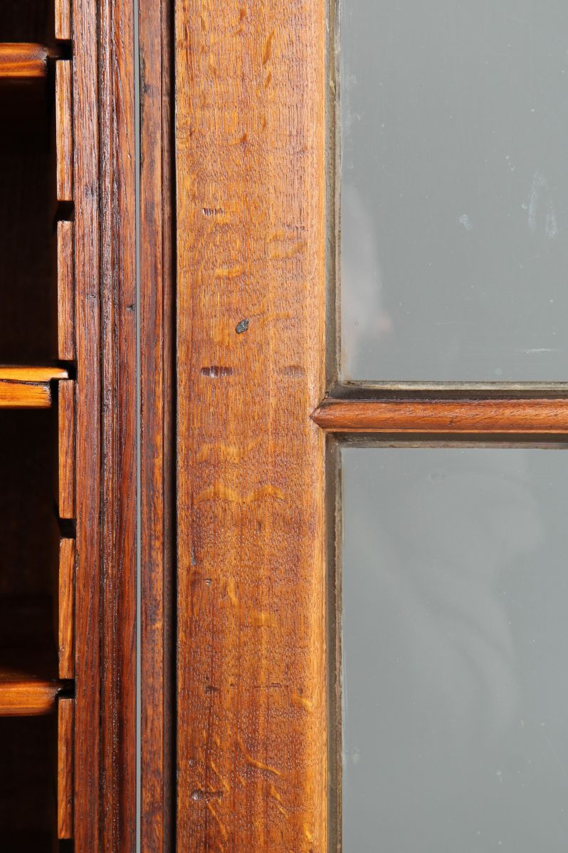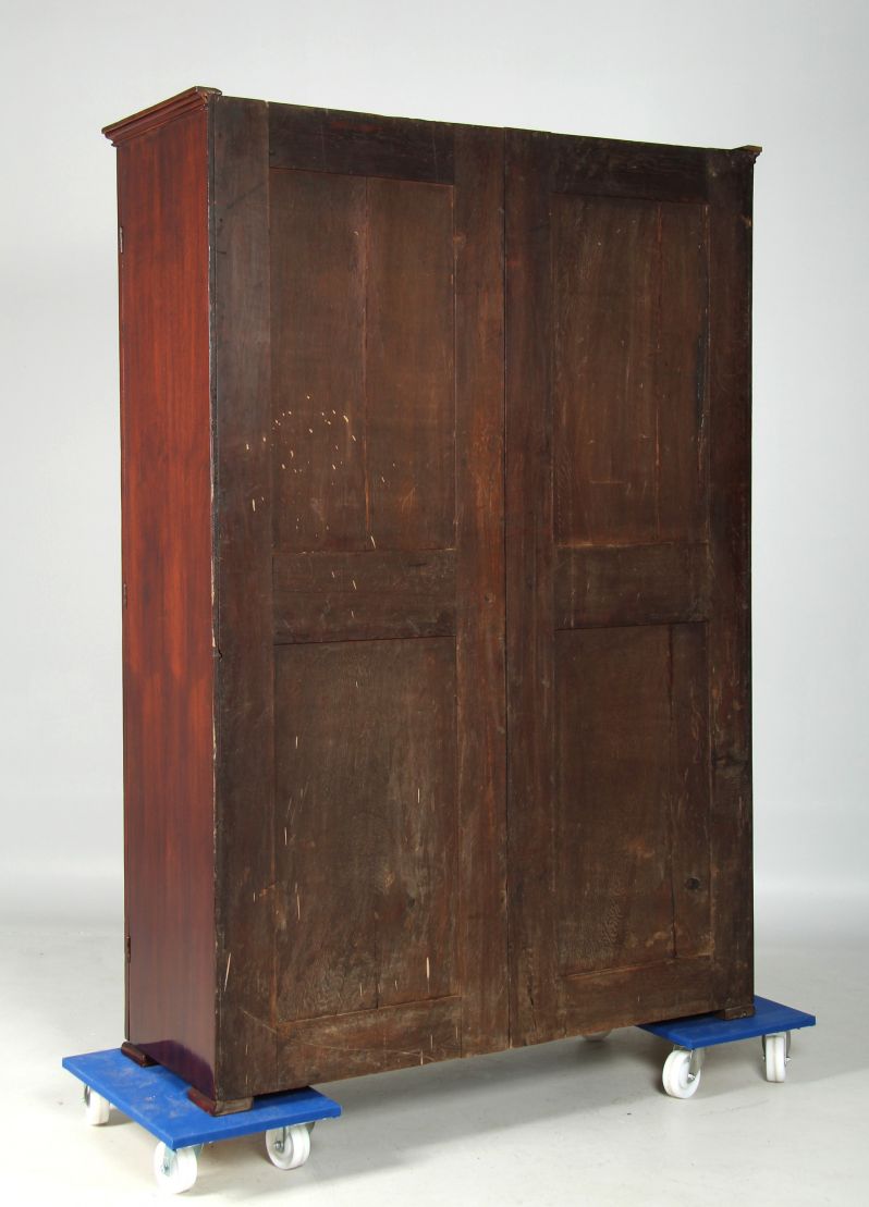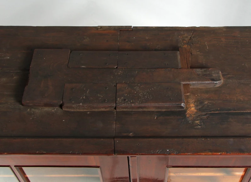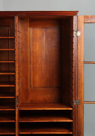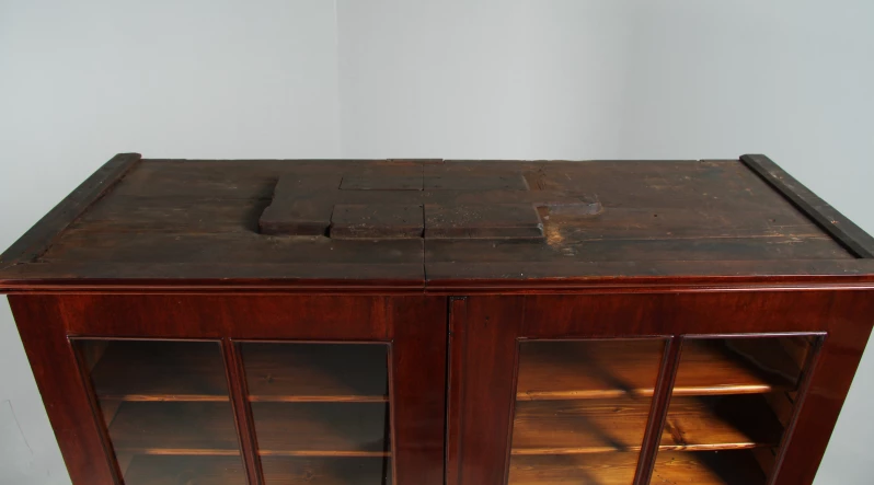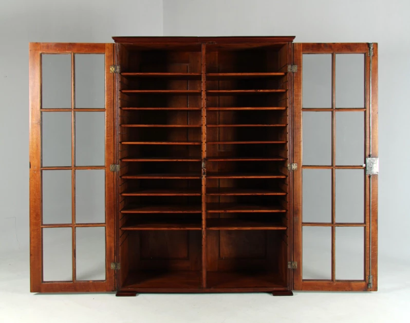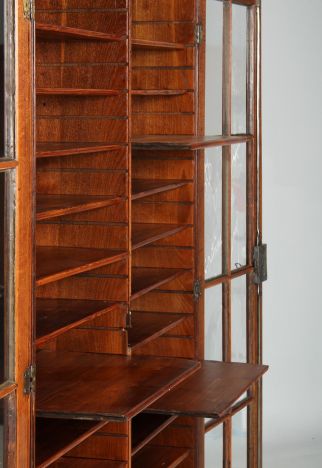 Diese außergewöhnliche Konstruktion lässt vermuten, dass das Möbelstück ursprünglich zur Aufbewahrung kostbarer und empfindlicher Sammlungsgegenstände diente. Die Einlegeböden sind höhenverstellbar, um eine optimale Anpassung an Sammlungsobjekte unterschiedlicher Größe zu ermöglichen. Die beiden untersten Fächer sind deutlich höher ausgeführt und könnten zur Aufbewahrung von Fachliteratur vorgesehen gewesen sein.