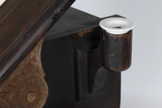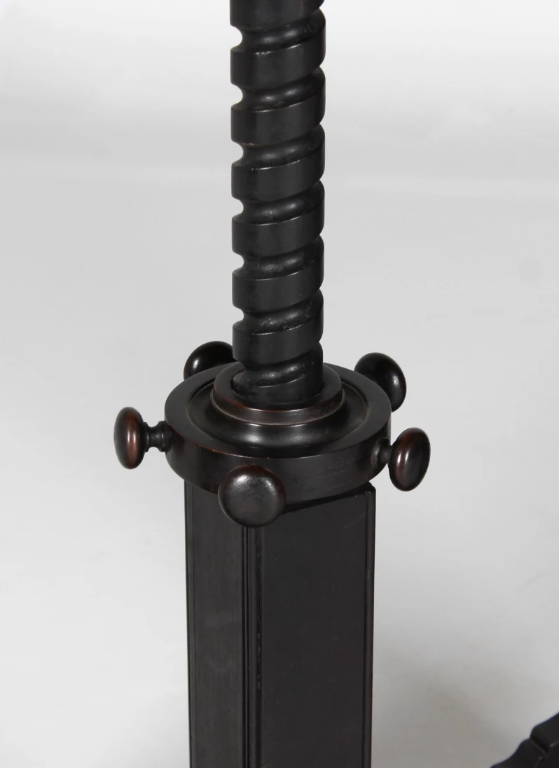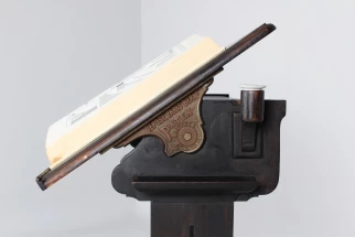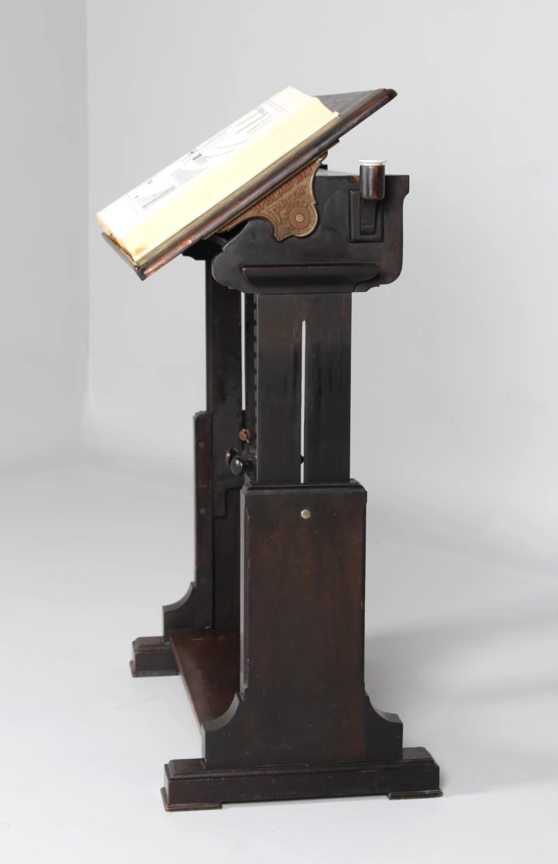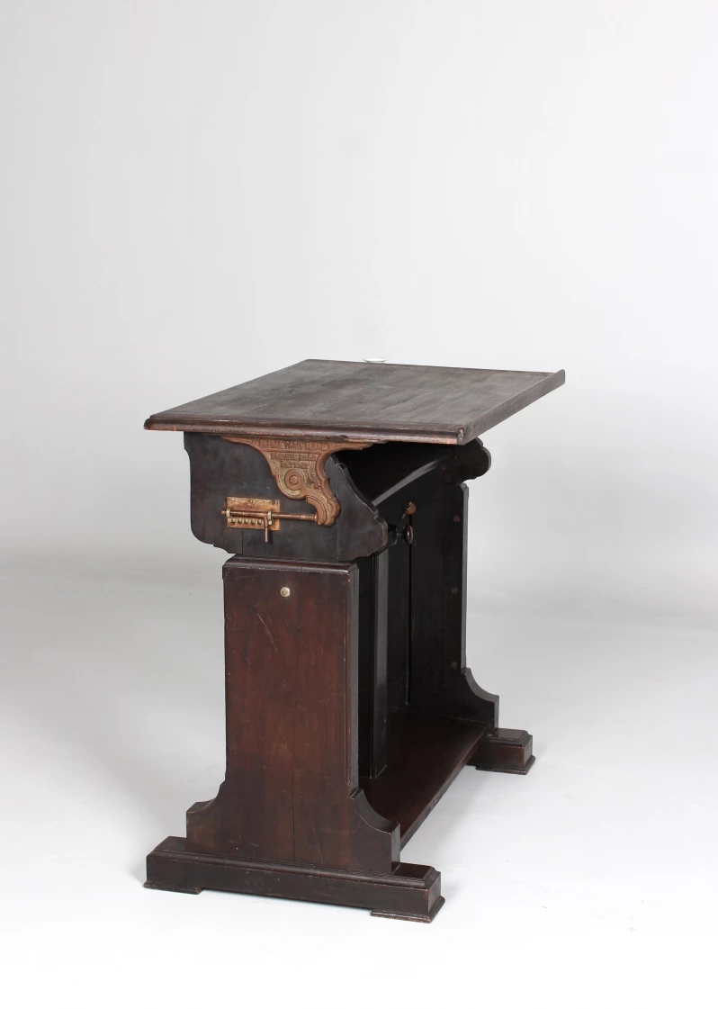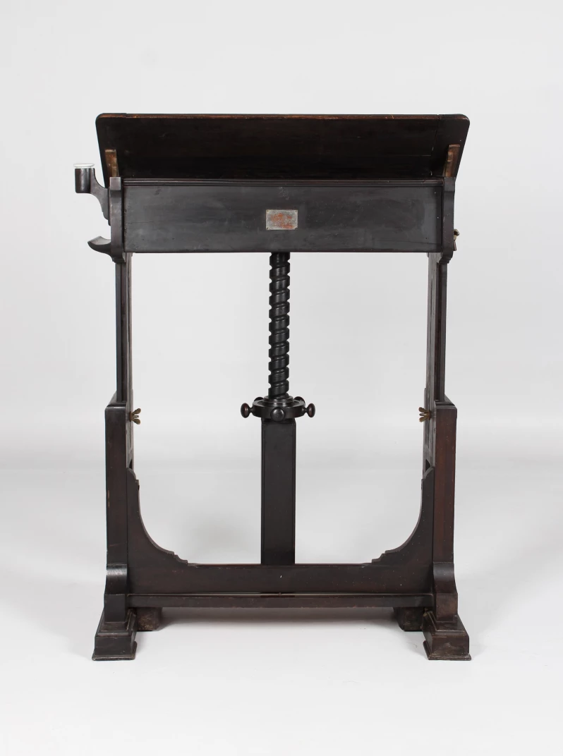 Höhenverstellbares Möbelstück, das als Schreib- und Zeichentisch oder auch als Rednerpult gedient haben mag. Nussbaum massiv, dunkel gebeizt.