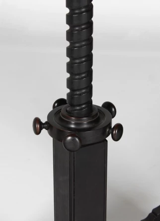 Mittig auf der Platte befindet sich ein hohles, senkrecht stehendes Kantholz, das zur Aufnahme der hölzernen Gewindestange dient, mittels derer der Tisch in der Höhe verstellt werden kann. Zwei Flügelmuttern auf den Innenseiten der Wangen dienen zur Arretierung in der gewünschten Höhe.
